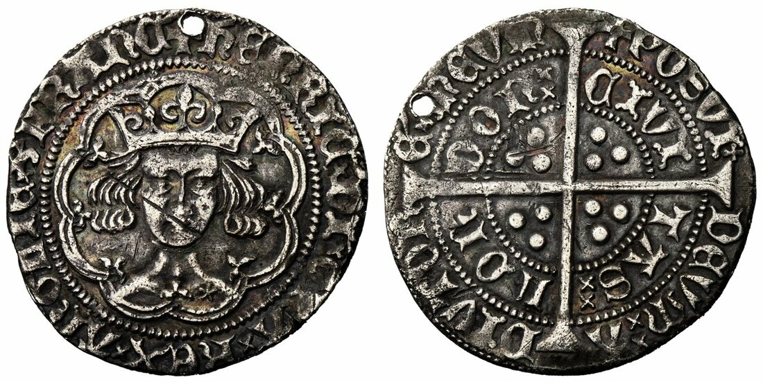 Henry V (1413-1422), Groat, Class Cb, Tower (London), with quatrefoil after hENRIC, crowned 'frowning' bust facing, mullet on right shoulder, rev. CIVITAS LONDON, long cross and trio of pellets in angles, 3.63g [56.02grns], 2h, m.m. pierced cross (North 1387(b); S.1765), drilled at 12 o'clock for suspension, and with an historic scuff on mouth, otherwise richly toned and a fuller flan, with underlying hints of colourful tone, almost very fine
