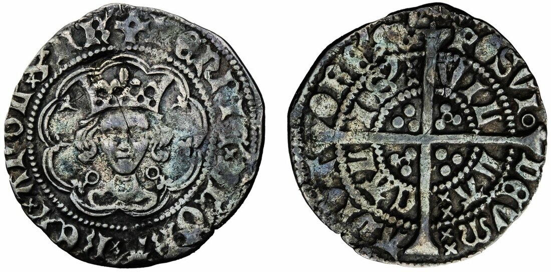 Henry VI, First Reign (1422-1461), Annulet Issue, Halfgroat, 1422-1427/30, Calais, crowned bust facing, annulets by neck, rev. annulet after POSVI, VILLA CALIS, long cross and trio of pellets in angles, additional annulets in second and third quarters, 1.66g [25.62grns], 12h, i.m. pierced cross [on obv. only] (North 1429; S.1840), pierced and expertly plugged, with otherwise rich dark field tone, almost very fine but of somewhat waterworn appearance