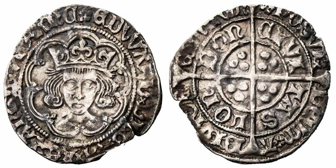 Edward IV, Second Reign (1471-1482), Groat, 1480-1483, Type XXI, Tower (London), crowned bust facing, rose on breast, rev. CIVITAS LOnDOn, long cross and trio of pellets in angles, 2.81g [43.36grns], 11h, m.m. heraldic cinquefoil (B&W XXI; North 1631; S.2100), flan split at 4 o'clock, otherwise of stable fabric on a irregular but full flan, lightly toned, very fine