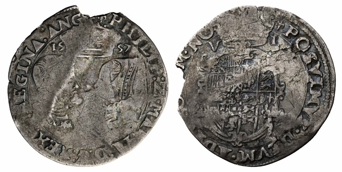 Mary and Philip (1554-1558), Sixpence, 1557, Tower (London), English titles, busts vis-à-vis, crown dividing date above, rev. crowned garnished shield, dividing value, 2.44g [37.65grns] 3h, m.m lys (North 1971; S.2506), chipped at 12 o'clock, and with bands of softness across flan and through portraits where once crimped, otherwise the legends better, toned, strictly fair to a bolder fine in parts, scarce