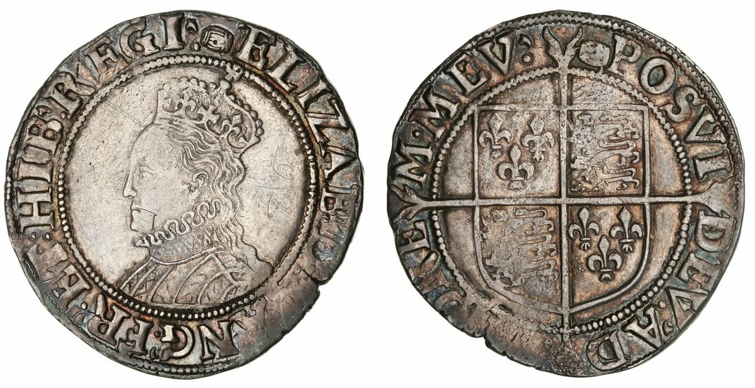 Elizabeth I (1558-1603), Sixth issue, Shilling, 1592-1595, Tower, crowned and draped bust 6B left, rev. square-topped shield over long cross fourchée, 6.39g [98.61grns], 1h, m.m. tun (North 2014; S.2577), face lightly brushed, '92' graffitied to obverse field and other light scratches, otherwise richly toned to legends, about very fine, reverse better