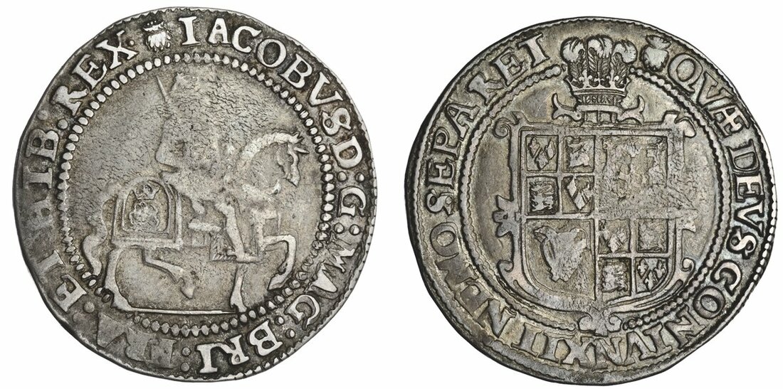 James I (1603-1625), Third Coinage, Halfcrown, 1621-1623, Tower (m.m.) IACOBVS D : G : MAG : BRI : FRA : ET HIB : REX •, king on horseback riding right, crowned rose on caparison, plain ground-line, rev. (m.m.) QVAE DEVS CONIVNXIT NEMO SEPARET, plume over square-topped garnished shield, 14.83g, 10h, m.m. thistle, (North 2123; S.2667), metal weakness in centres but a full round coin, very fine