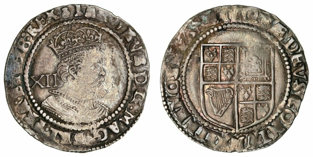 James I (1603-1625), Third Coinage, Shilling, 1621-1623, Tower, sixth crowned and armoured bust right, XII behind, rev. square-topped shield, six strings to bird-headed harp, 5.94g [91.67grns], 5h m.m. thistle (North 2124; S.2668), patch of porosity and verdigris to edge, otherwise darkly toned, very fine