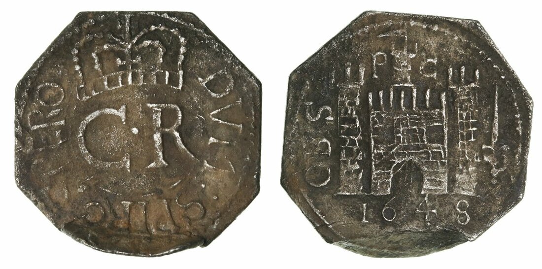 Charles I (1625-1649), Civil War Issues, Third Siege of Pontefract (June 1648 - March 1649), 'Octagonal' Shilling, 1648, on a lightweight flan, DVM : SPIRO SPERO, large lettering, crowned large C•R, rev. castle gateway with flag dividing P-C, brandished arm and sword in right field, OBS upwards in left, 3.93g [60.65grns], 12h (Nelson, Fig. 44; Hird 272-274; Brooker 1231; North 2646; S.3148), some porosity to the metal and a bend in the flan at bottom of coin, other full and toned, about very fine