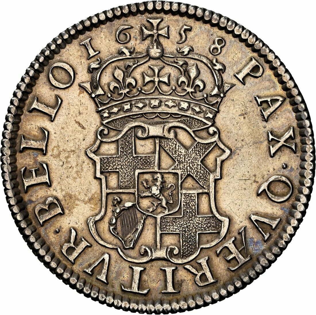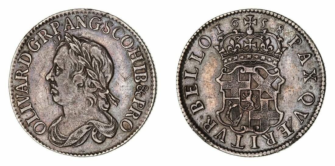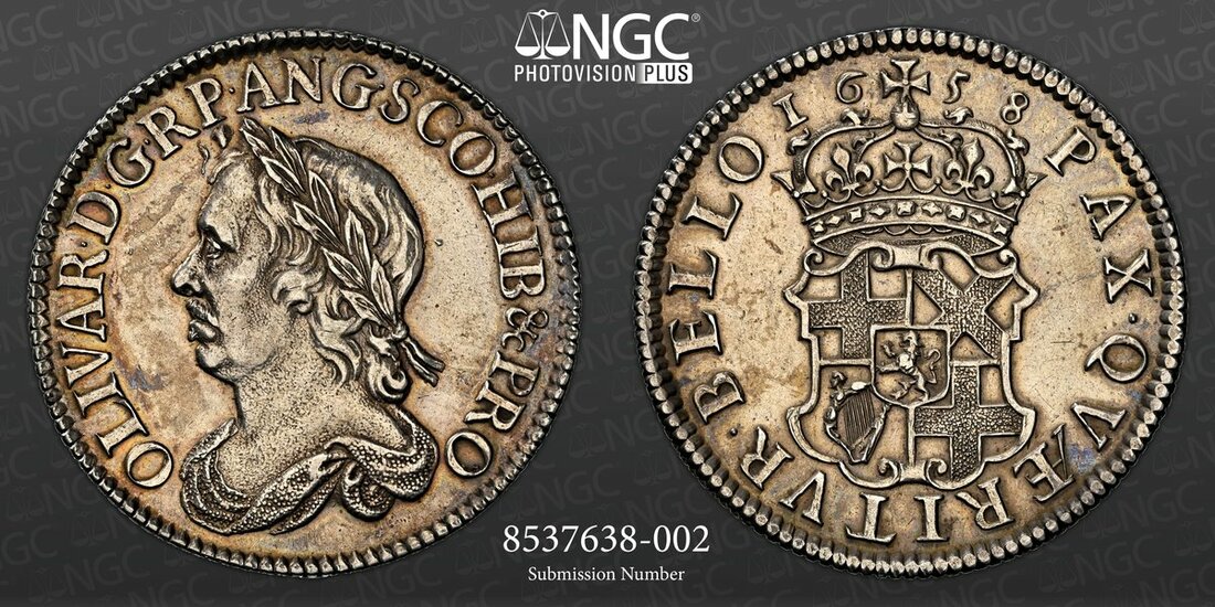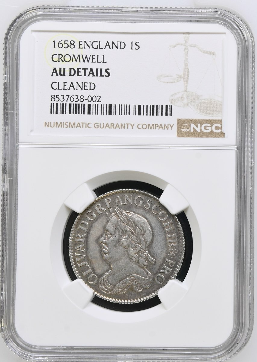 NGC AU | Cromwell, as Lord Protector (1653-1658), Shilling, 1658, Drury House (London), OLIVAR • D • G • R P • ANG • SCO • ET • HIB &c PRO, laureate and draped bust left, rev. PAX • QVÆRITVR • BELLO, crowned and garnished shield of the Protectorate, edge straight milled, 5.95g, 6h (ESC 1005; Bull 254; S.3228), cleaned but with some residual original tone about legends, very fine, in NGC holder graded AU Details ~ Cleaned (Cert. #8537638-002)