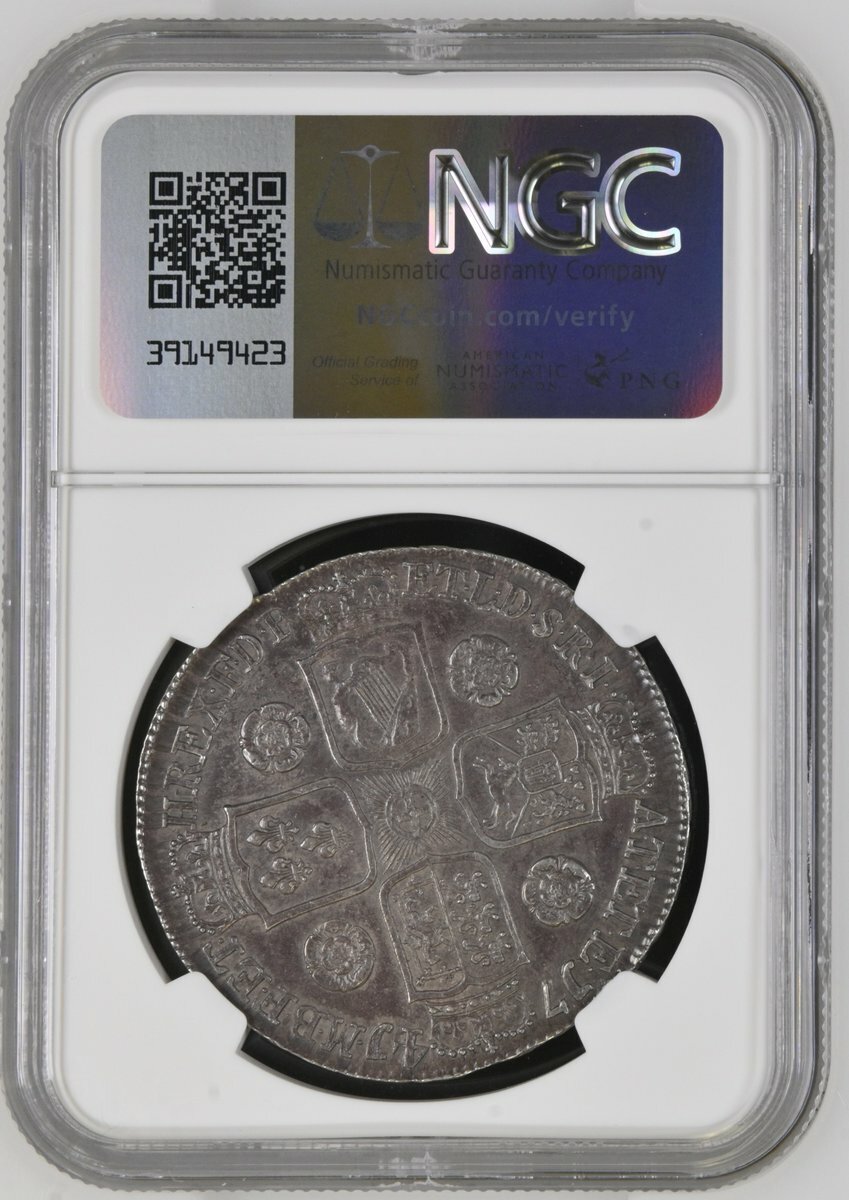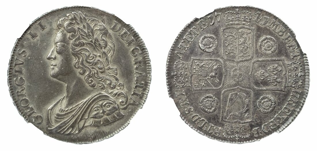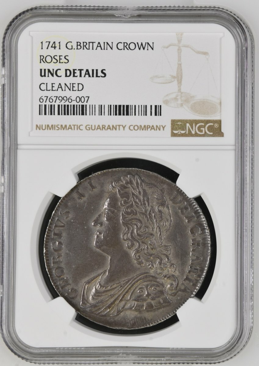 (x) NGC UNC | George II (1727-1760), 'Roses' Crown, 1741 DECIMO QVARTO, larger obverse lettering, young laureate, draped and cuirassed bust left, rev. crowned shields cruciform, roses in angles, eight strings to harp, seven hearts, large lettered edge downwards, 29.99g, 6h (ESC 123; Bull 1666; S.3687), some scratches behind bust, otherwise uniformly darkened and glossy surfaces, barring small spot below bust, reverse better, near extremely fine, a lovely coin!, in NGC holder, erroneously graded NGC UNC Details ~ Cleaned (Cert. #6767996-007)