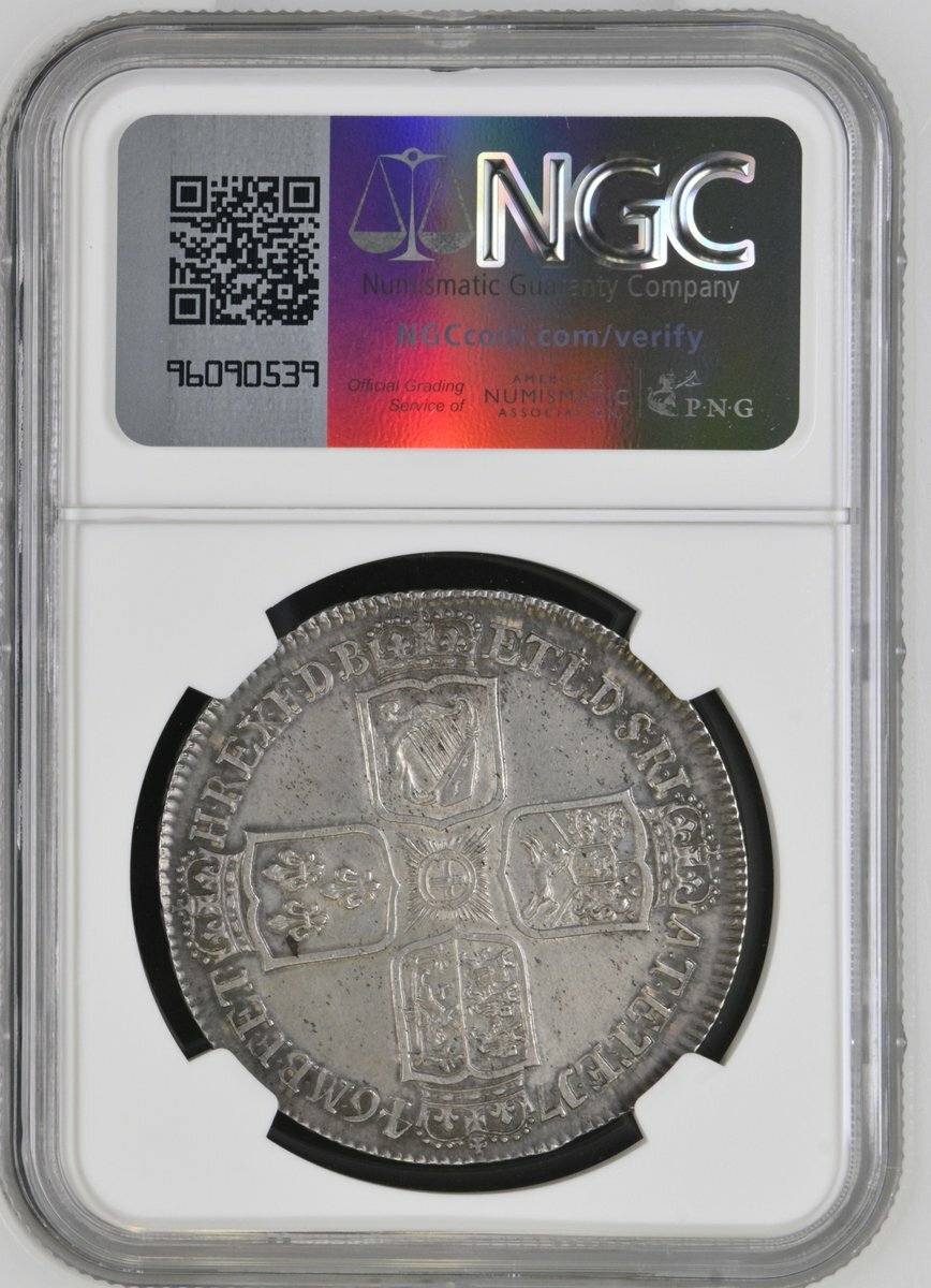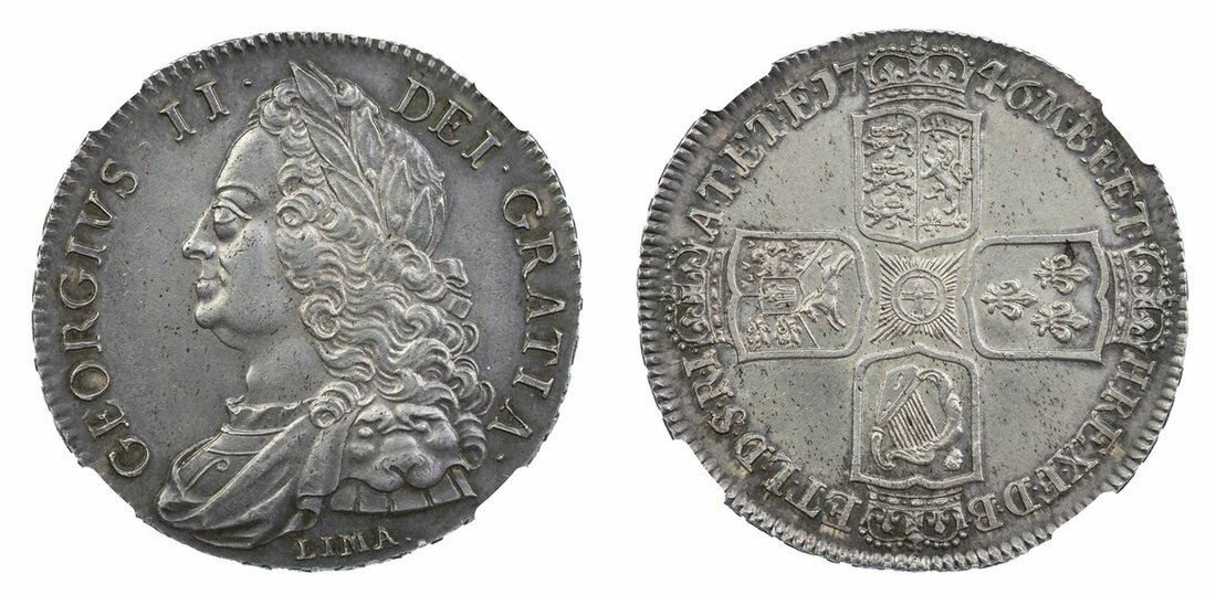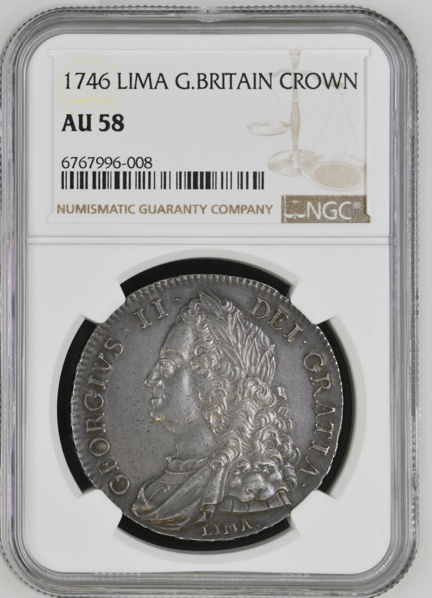 (x) NGC AU58 | George II (1727-1760), 'Lima' Crown, 1746 DECIMO NONO, old laureate, draped and cuirassed bust left, LIMA below, rev. crowned shields cruciform, ten strings to harp, angles plain, edge lettered downwards, 30.10g, 6h (Pywell-Phillips 313; ESC 125; Bull 1668; S.3689), light flecking, with a pleasing blue tone to residually lustrous fields, most pleasing to reverse devices, extremely fine, in NGC holder, graded AU58 (Cert. #6767996-008)