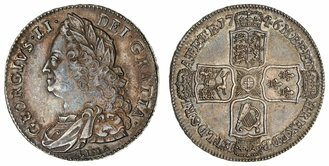 George II (1727-1760), 'Lima' Halfcrown, 1746 DECIMO NONO, V in GEORGIVS, old laureate, draped and cuirassed bust left, LIMA below, rev. four crowned shields cruciform, seven strings to harp, seven hearts, downwards lettered edge, 15.03g, 6h (Bull 1688; ESC 606; S.3695A), obverse struck from a lightly rusted die, touch of softness to hair, otherwise richly toned, good very fine / extremely fine