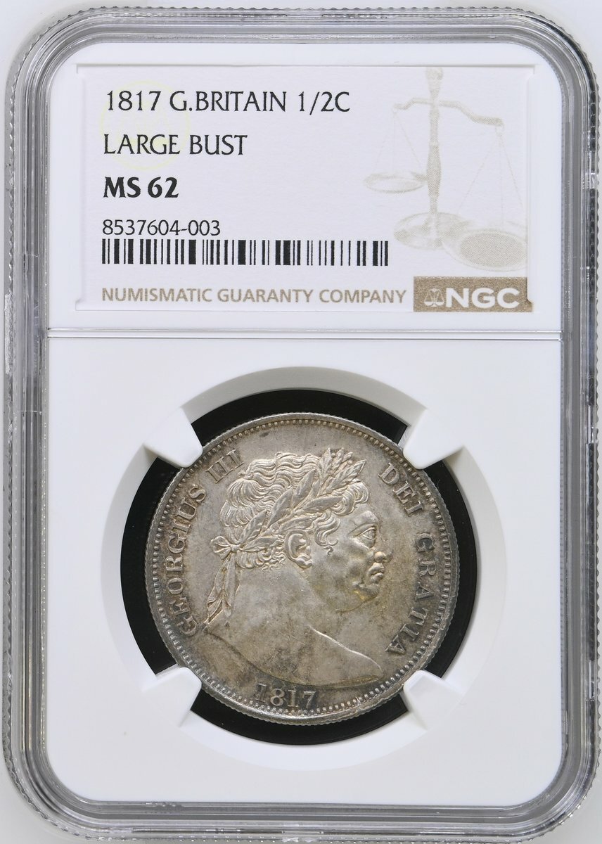 NGC MS62 | George III (1760-1820), 'New Coinage', Halfcrown, 1817, Type 1, laureate bust right, rev. crowned shield in Garter, edge milled, 14.18g, 12h (ESC 616; Bull 2090; S.3788), some very minor contact marking, otherwise toned and lustrous, extremely fine, the reverse better, in NGC holder, graded MS62 (Cert. #8537604-003)