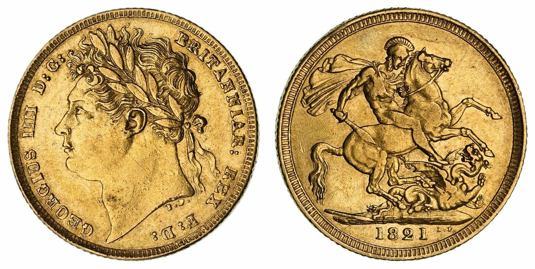 George IV (1820-1830), Sovereign, 1821, Type 1, laureate head left, rev. St. George and Dragon, edge milled, 7.93g, 6h (Marsh 5; MCE 471; EGC II, 959; Bentley 12; Stratos 119-120; S.3800), lightly contact marked and rubbed to tops of devices, flash of lustre in legends, very fine