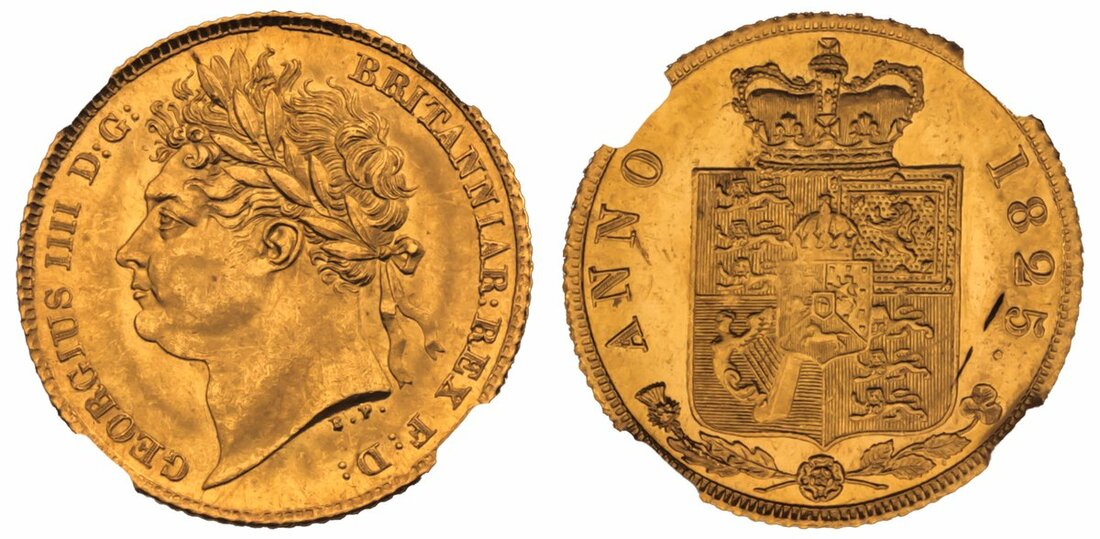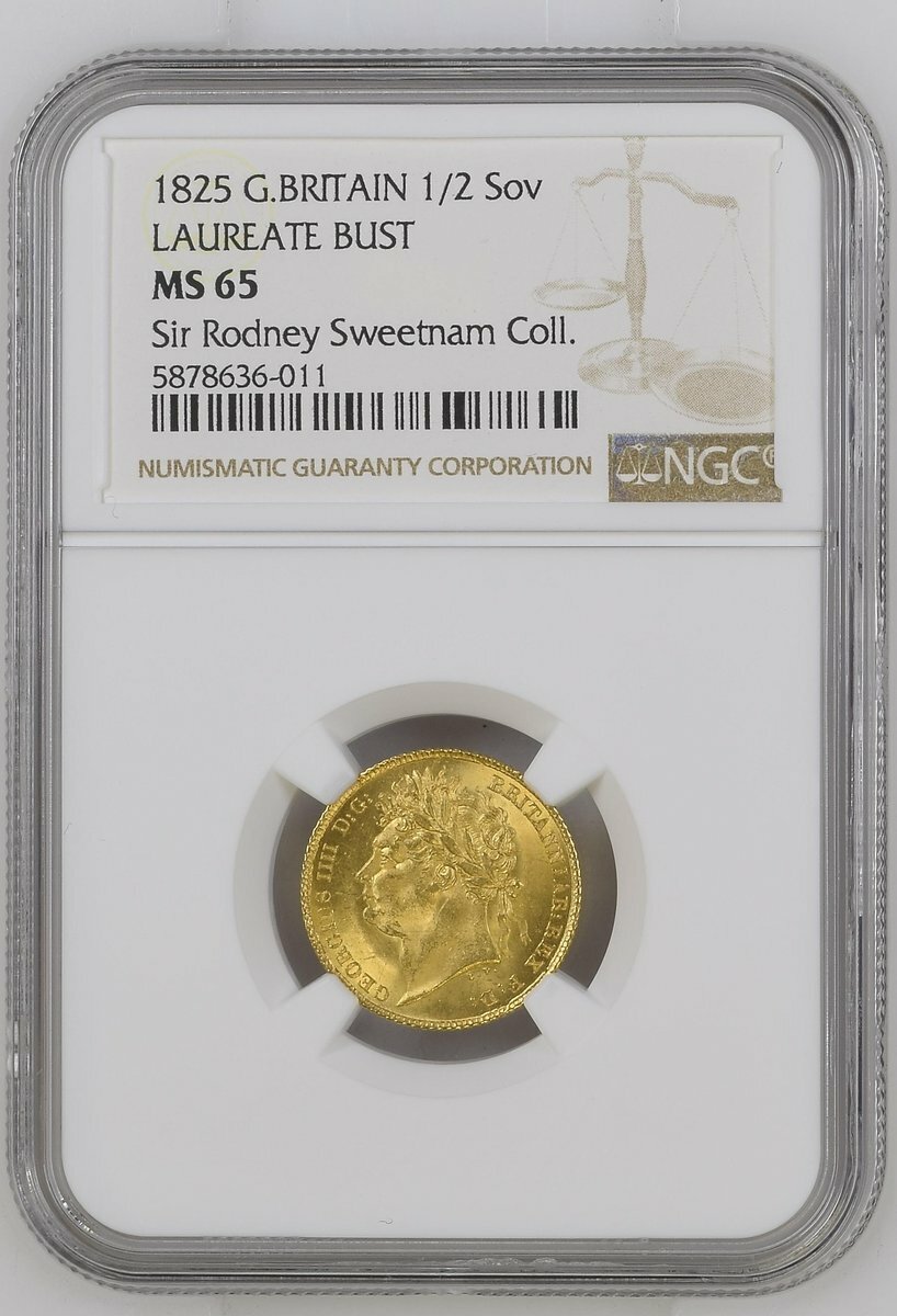 (g) NGC MS65 | *Top Pop* | George IV (1820-1830), Half-Sovereign, 1825, Type 2, London, laureate head left, rev. crowned shield, edge milled, 4.00g*, 7h (MCE 485; Marsh 406; EGC II, 994; S.3803), handsomely choice, the reverse brilliant, choice mint state, a lovely coin, in NGC 'Sweetnam' holder, righteously graded MS65 *Top Pop* (Cert. #5878636-011) [*Joint Finest Certified*]