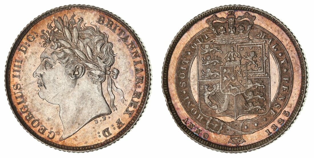 George IV (1820-1830), Sixpence, 1825, laureate head left, rev. crowned arms in garter, edge milled, 2.82g, 6h (ESC 1659; Bull 2427; S.3814), some minor contact marks, otherwise toned and with a flashy lustre, extremely fine