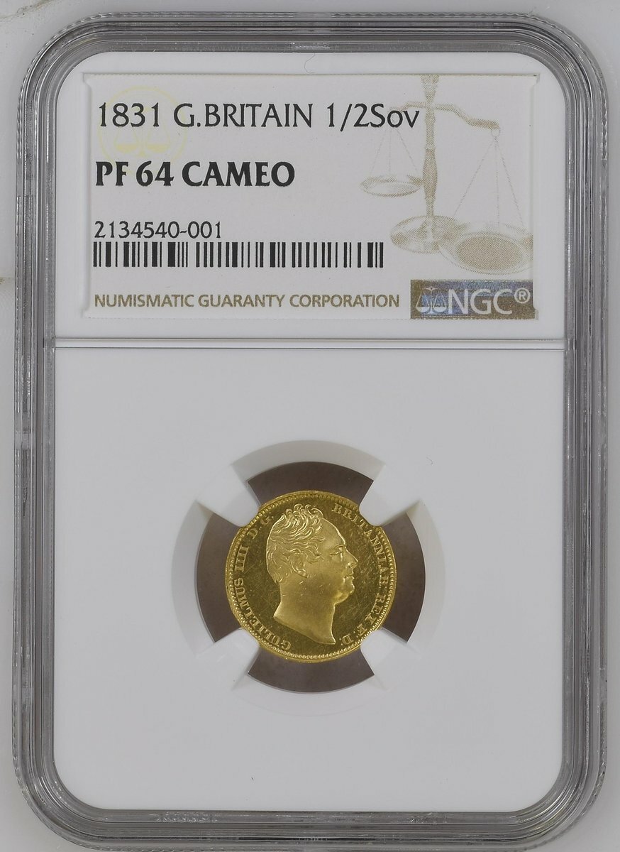 (x) NGC PF64 CAMEO | *Top Pop* | William IV (1830-1837), Proof Half-Sovereign, 1831, by William Wyon and Jean-Baptiste Merlen, bare head right, plain truncation, rev. crowned shield on mantle, ANNO - 1831 below, edge plain, 3.99g*, 6h (EGC II, 1038 [S]; Marsh 409E; W&R 267; S.3830), some minor surface marking atop otherwise brilliant fields, with a handsome cameo definition, pleasing extremely fine, in NGC holder, graded PF64 CAMEO *Top Pop* (Cert. #2134540-001) [*Joint Finest Certified*]