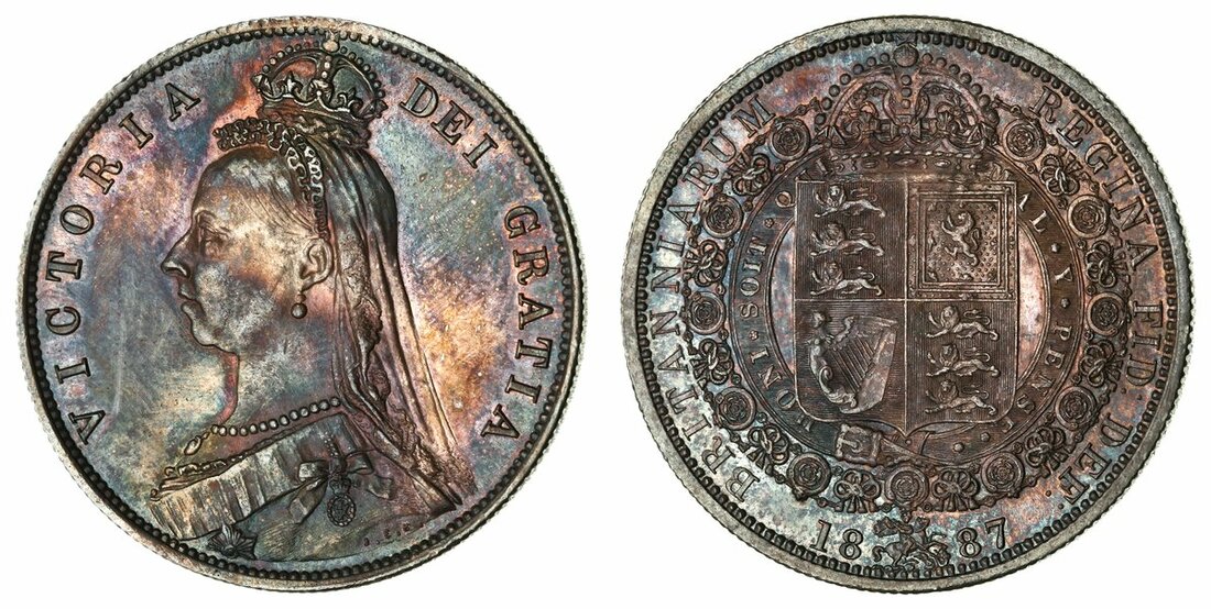 Victoria (1837-1901), 'Golden Jubilee' Halfcrown, 1887, crowned 'Jubilee' bust left, rev. crowned shield in Garter, edge milled, 12h, 14.14g (ESC 719; Bull 2771; S.3924), obverse with some hairlines and small brushed area before neck, subsequently richly toned and with a flashy lustre, extremely fine