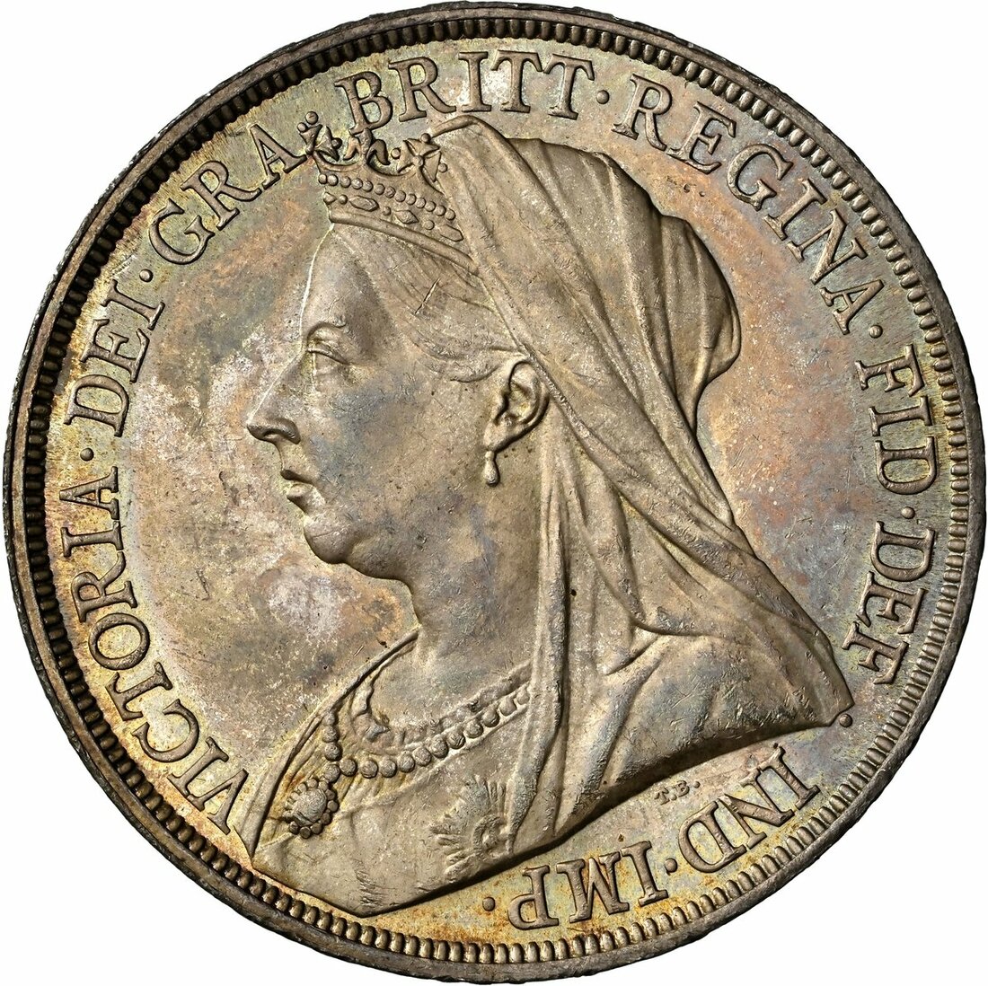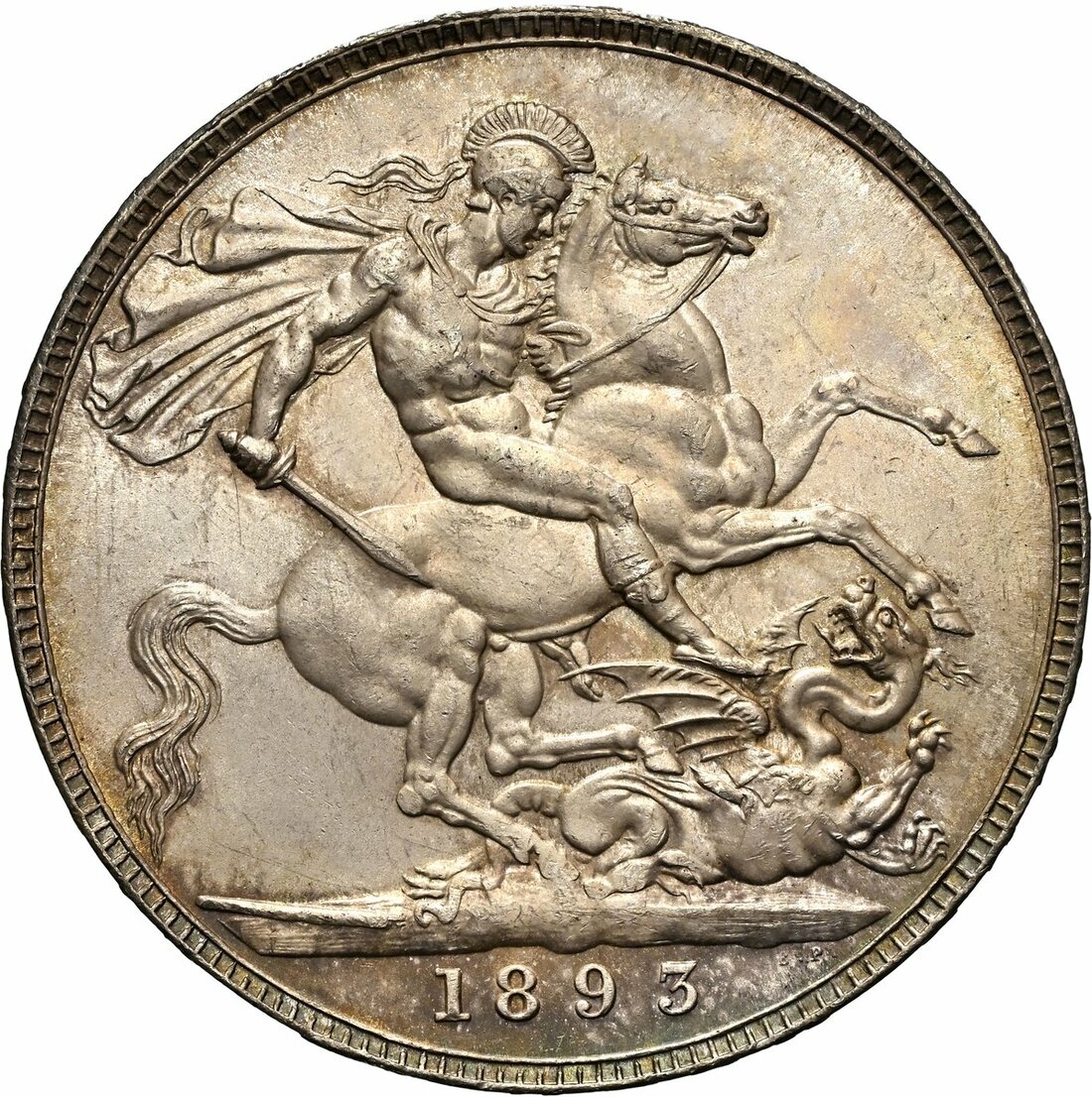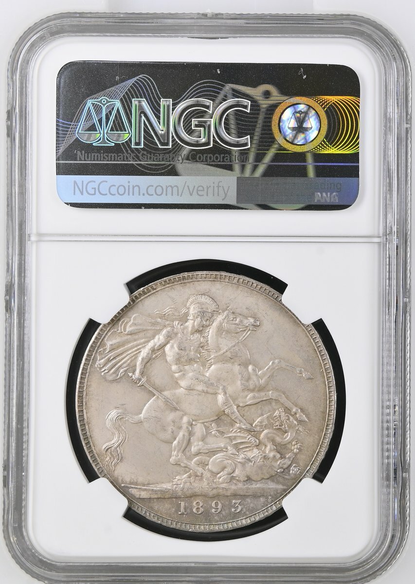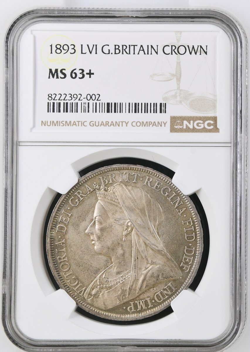 NGC MS63+ | Victoria (1837-1901), 'Old Head' Crown, 1893 LVI, crowned veiled or 'widow' head left, rev. St George and Dragon, edge lettered upwards, 28.26g, 12h (ESC 303; Bull 2593; S.3937), a magnificent Crown, pearlescent, cabinet-toned and residually brilliant, truly struck like a proof, choice FDC, in NGC holder, graded MS63+ (Cert. #8222392-002)