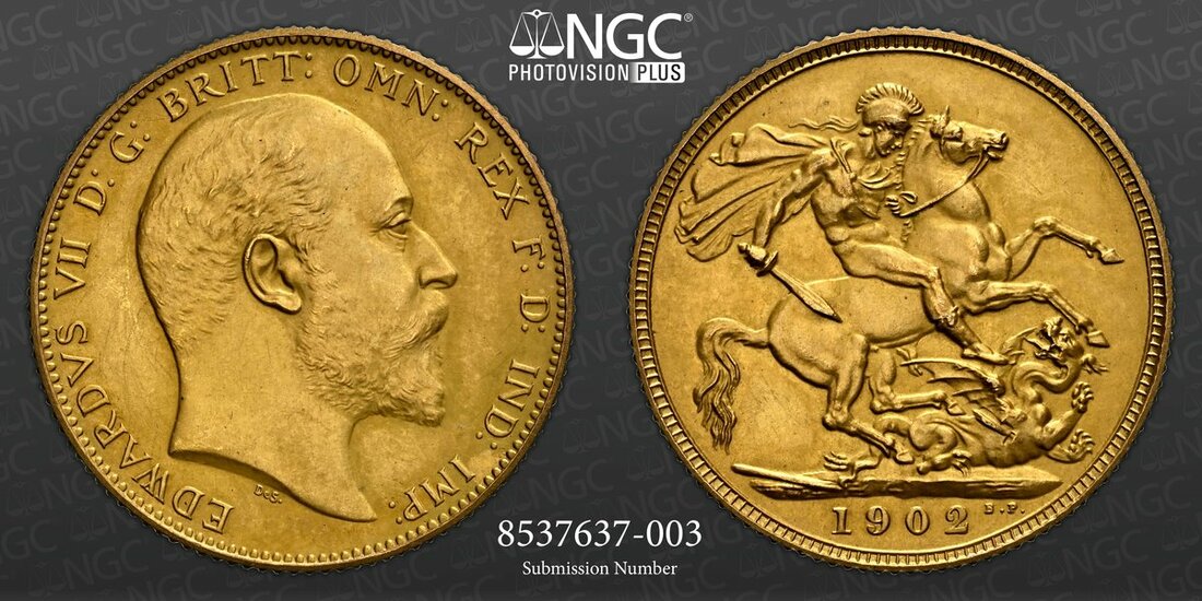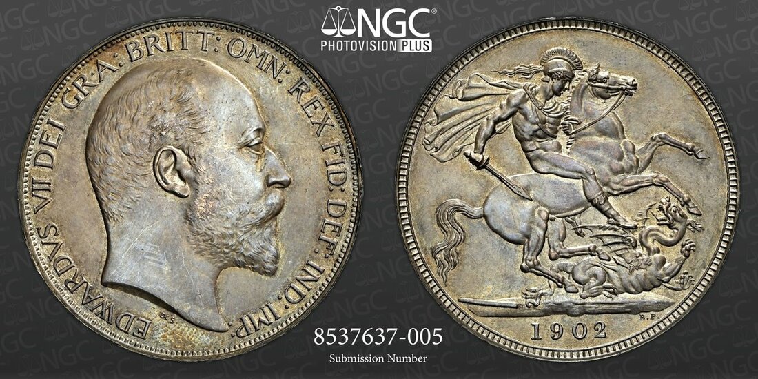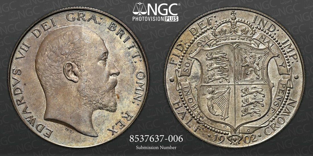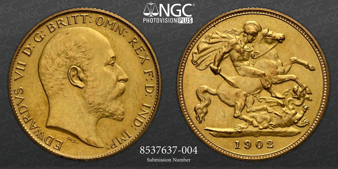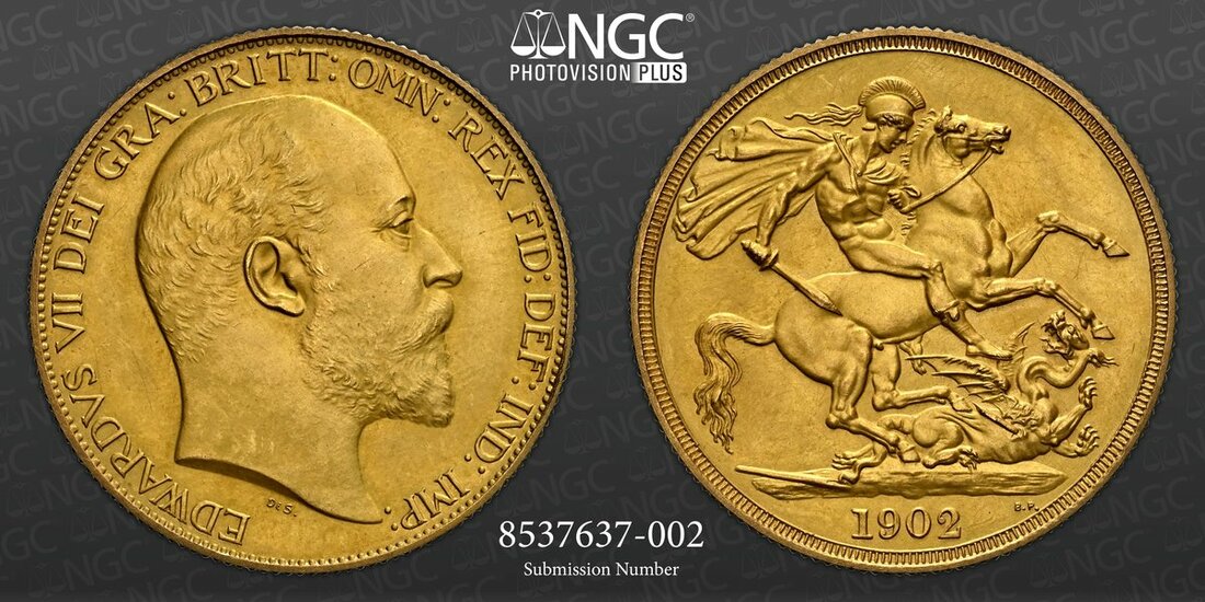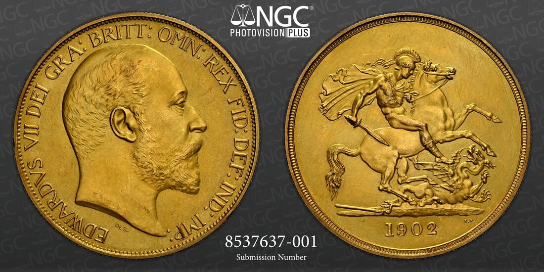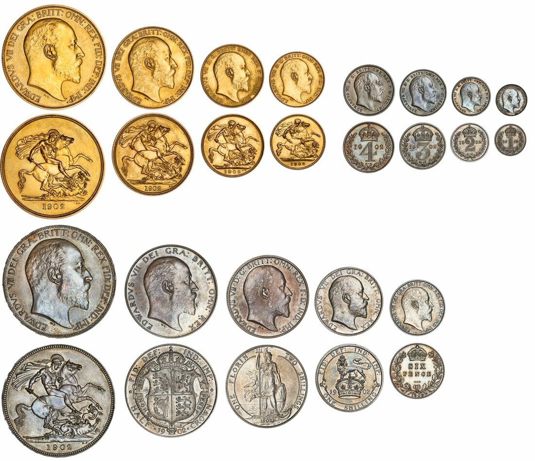 (g) NGC PF64+ MATTE-PF61 MATTE | Edward VII (1901-1910), Coronation 'Specimen' Matte Proof 'Long' Set, 1902 (13), Five-Pounds to Half-Sovereign, Crown to Sixpence and Maundy Penny (S.PS9), a fine sandblasted set, generally extremely fine to much as issued, with original box, in NGC holders graded PF61 MATTE [Five-Pounds] (Cert. #8537637-001); PF64 MATTE [Two-Pounds] (Cert. #8537637-002); PF62 MATTE [Sovereign] (Cert. #8537637-003); PF62 MATTE [Half-Sovereign] (Cert. #8537637-004); PF63 MATTE [Crown] (Cert. #8537637-005); PF64 MATTE [Halfcrown] (Cert. #8537637-006); PF64 MATTE [Florin] (Cert. #8537637-007); PF64+ MATTE [Shilling] (Cert. #8537637-008); PF62 MATTE [Sixpence] (Cert. #8537637-009); PF63 MATTE [Fourpence] Cert. #8537637-010); PF63 MATTE [Threepence] (Cert. #8537637-011); PF64 MATTE [Twopence] (Cert. #8537637-012); PF63 MATTE [Penny] Cert. #8537637-013) (13)