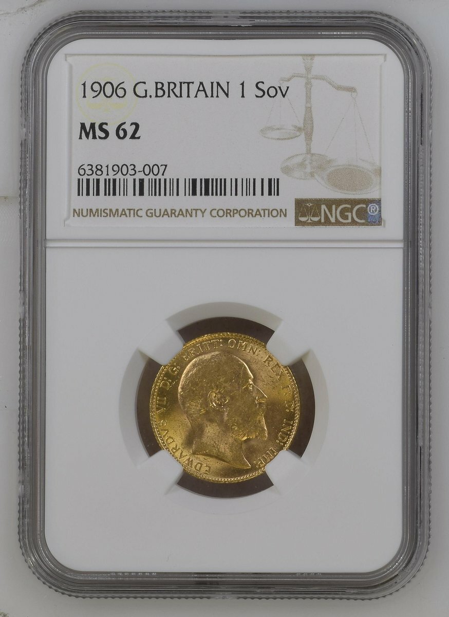 (x) NGC MS62 | Edward VII (1901-1910), Sovereign, 1906, bare head right, rev. St George and Dragon, edge milled, 7.99g*, 12h (EGC II, 1411; Bentley 351; MCE 625; Marsh 178; S.3969), some light contact marking, otherwise with a minty lustre, extremely fine, in NGC holder, graded MS62 (Cert. #6381903-007)