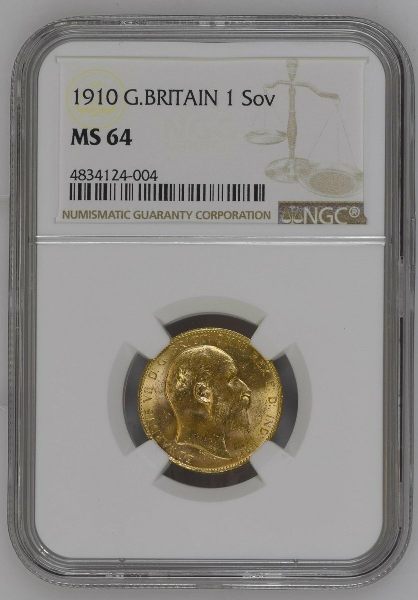 (x) NGC MS64 | Edward VII (1901-1910), Sovereign, 1910, bare head right, rev. St George and Dragon, edge milled, 7.99g*, 12h (EGC II, 1416; Bentley 355; MCE 629; Marsh 182; S.3969), some minor surface marking, otherwise with a pleasing mint bloom, extremely fine, in NGC holder, graded MS64 (Cert. #4834124-004)