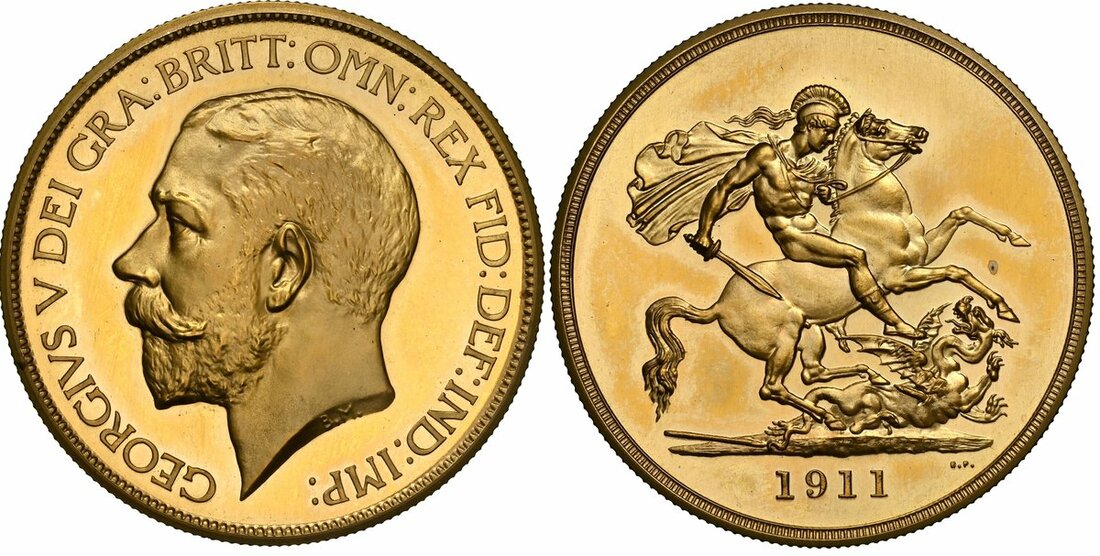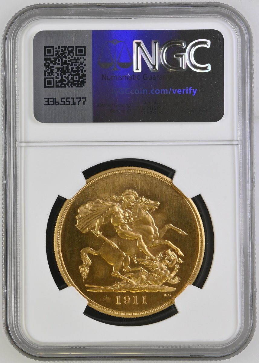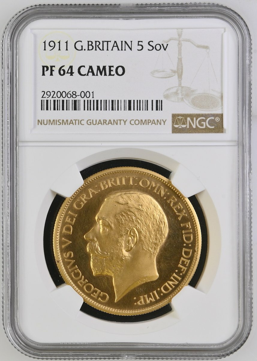 (x) NGC PF64 CAMEO | George V (1910-1936), Coronation 'Specimen' Proof Five-Pounds, 1911, bare head left, rev. St George and Dragon, edge milled, 39.94g*, 12h (EGC II, 1430; Marsh F38; S.3994), faint wispy hairlines in fields, otherwise with a handsome cameo definition and with brilliant fields, choice uncirculated, in NGC holder, graded PF64 CAMEO (Cert. #2920068-001)