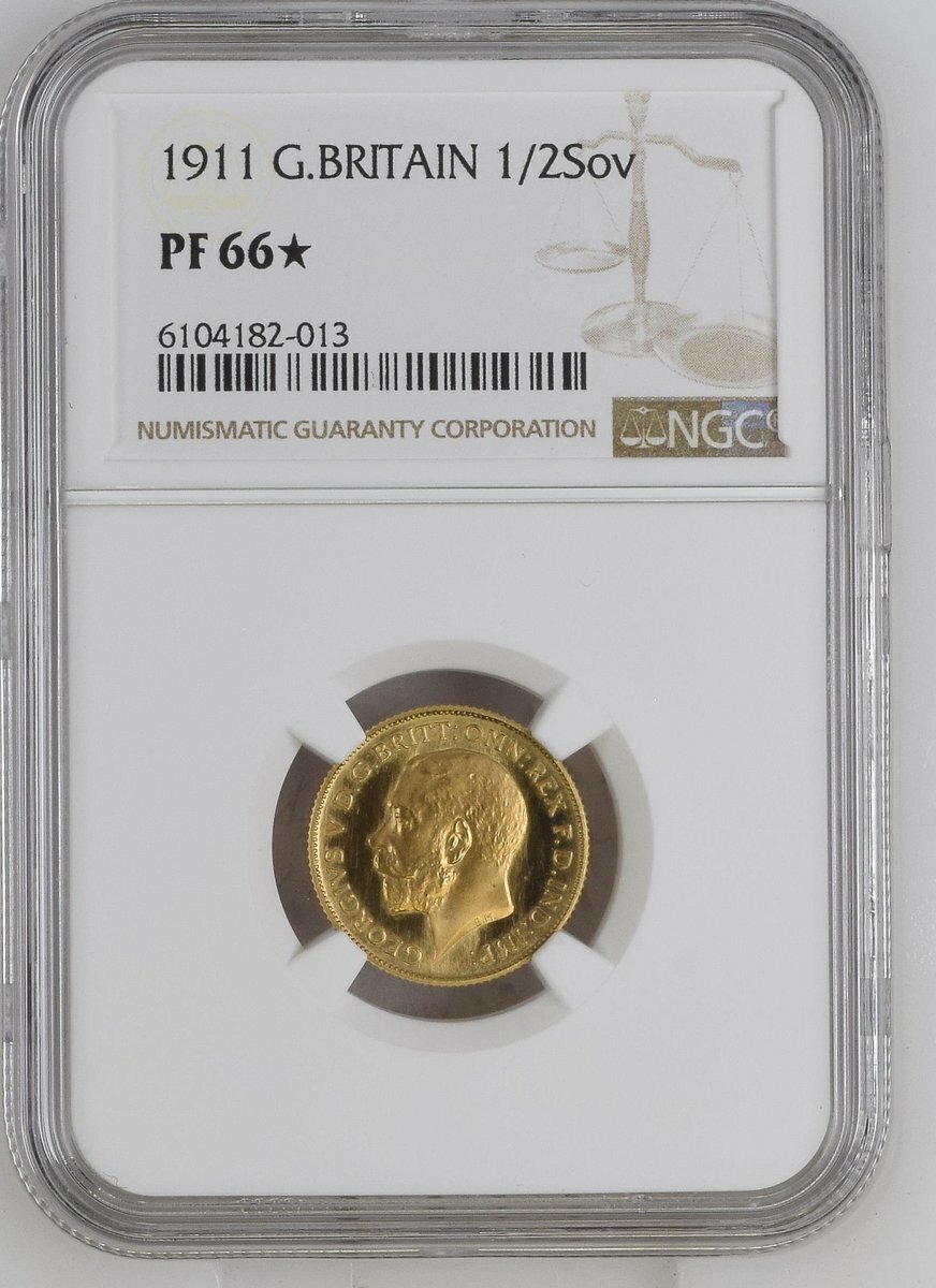 (x) NGC PF66* | George V (1910-1936), Coronation 'Specimen' Proof Half-Sovereign, 1911, bare head left, rev. St George and Dragon, edge milled, 3.99g*, 12h (W&R 418; Marsh 526A; MCE 647; EGC II 1443; S.4006), hairlined to otherwise brilliant fields, much as struck, in NGC holder, graded PF66* (Cert. #6104182-013)