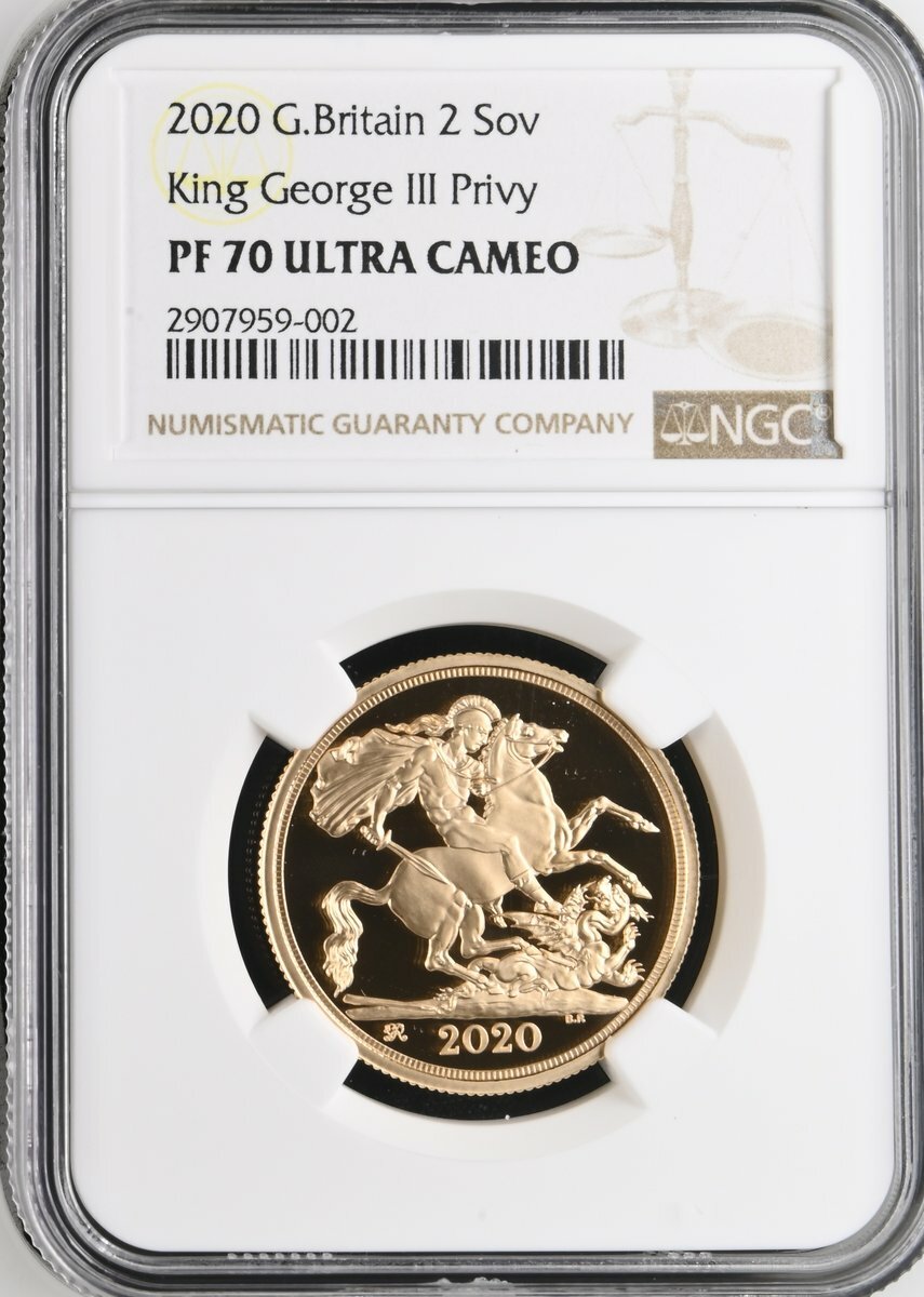 (x) NGC PF70 UCAM | *Top Pop* | Elizabeth II (1952-2022), Proof Two-Pounds, 2020, with George III Royal Cypher, fifth crowned bust right, by Jody Clark, rev. St George and Dragon, cypher in exergue, edge milled, 15.97g*, 12h (S.SD9B), with a handsome cameo definition, brilliant as struck, in NGC holder, graded PF70 (Cert. #2907959-002) [*Joint Finest Certified*]