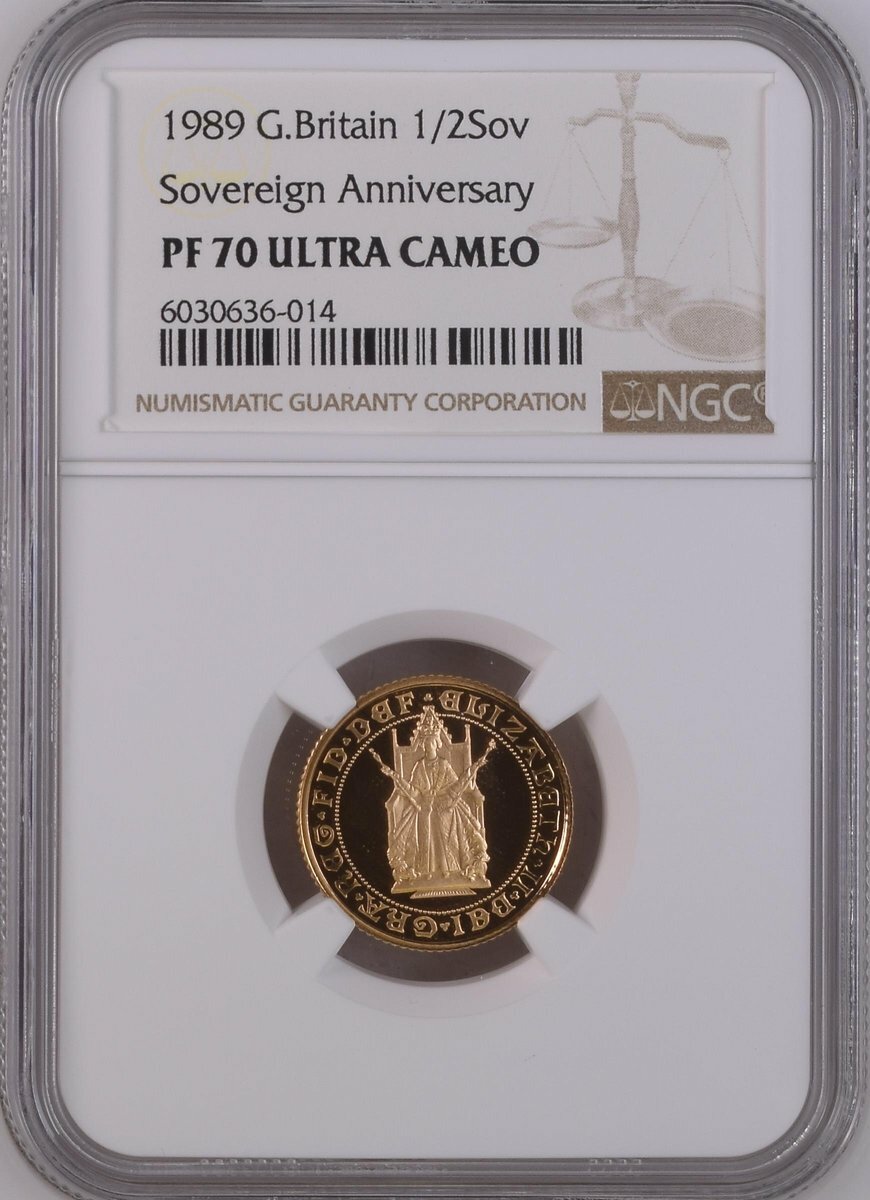 (x) NGC PF70 UCAM | *Top Pop* | Elizabeth II (1952-2022), Proof Half-Sovereign, 1989, '500th Anniversary of the Sovereign', by Bernard R. Sindall, Elizabeth II seated in King Edward's chair, rev. shield of Our Royal Arms ensigned by Royal Crown, double rose behind, edge milled, 3.99g*, 12h (Marsh 544H; S.SB3), handsome cameo definition, brilliant as struck, in NGC holder, graded PF70 UCAM (Cert. #6030636-014) [*Joint Finest Certified*]