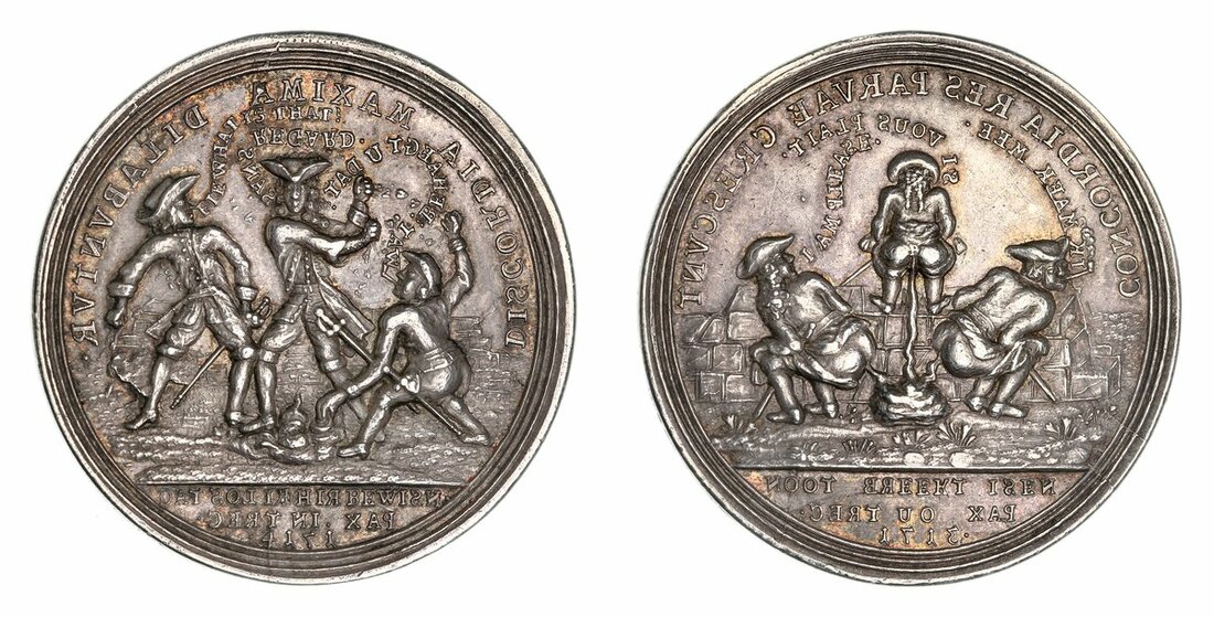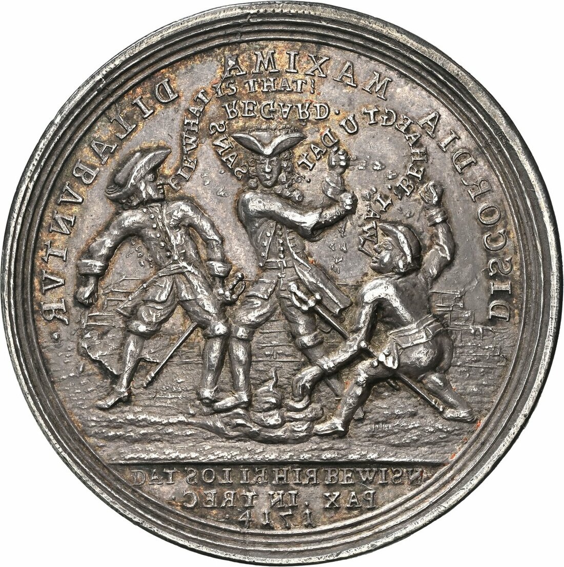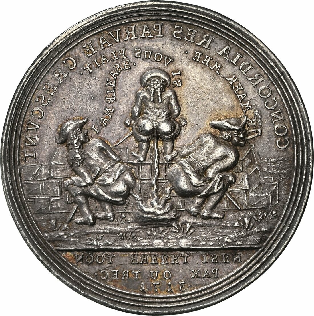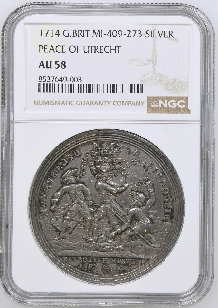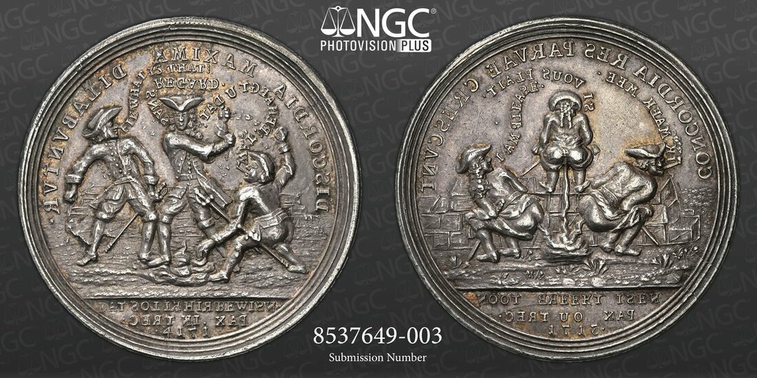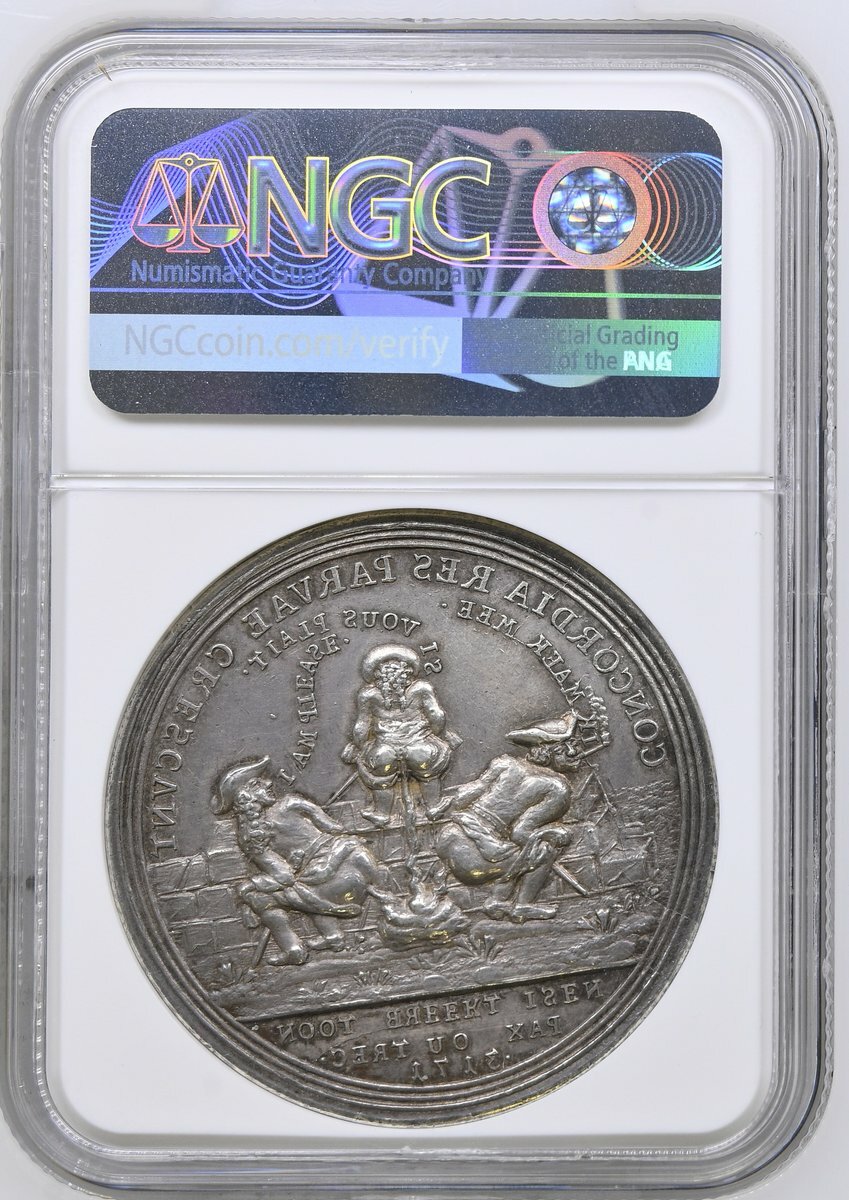 NGC AU58 | *Top Pop* | On the Ratification of the Peace of Utrecht, Satirical AR Medal, 1714, by Christian Wermuth, an Englishman (saying: I AM PLEASE), a Frenchman (saying SI VOUS PLAIT), and a Dutchman, smoking a pipe (saying IK MAEK MEE), all partially undressed, defecating over a wall, CONCORDIA RE PARVAE CRESCVNT., NOOT BREKT ISEN . PAX OU TREC . 1713. in exergue, rev. the same three men, now fully dressed, throwing faeces at each other; the Englishman (saying FIE, WHAT IS THAT!); the Frenchman (saying: SANS REGARD); and the Dutchman, still smoking his pipe (saying: WAT! BEHAEGT U DAT?), DISCORDIA MAXIMA DILABVNTVR., DAT SOL IE HIER BEWISN . PAX IN TREC . 1714. in exergue, edge plain, 44.2mm, 27.56g (Eimer -; MI ii 409/273; Wohlfahrt 14 010), some rub to tops of devices, otherwise toned and with lustre, about extremely fine, a remarkable satirical medal at the height of 18th Century Anglo-Continental hostilities, in NGC holder, graded AU58 (Cert. #8537649-003) [*Single Finest Certified*]