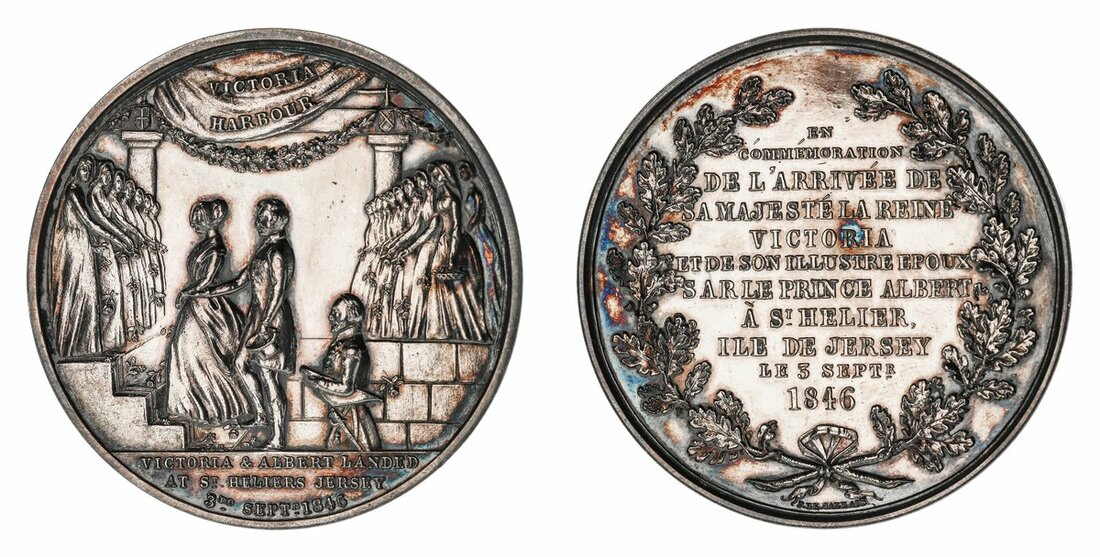Victoria and Prince Albert, Royal Visit to Jersey, AR Medal, 1846, by J. Le Gallais, Victoria and Albert, mounting steps of the quayside, greeted by women bearing floral tributes, VICTORIA HARBOUR on canopy above, VICTORIA & ALBERT LANDED AT ST HELIERS JERSEY 3RD SEPTR. 1846, in exergue in three lines, rev. EN COMMEMORATION DE L'ARRIVEE DE SA MAJESTE LA REINE VICTORIA ET DE SON ILLUSTRE EPOUX SARLE PRINCE ALBERT A ST HELIER ILE DE JERSEY LE 3 SEPTR 1846, in 11 lines, within floral wreath, 51mm, 48.53g (Eimer 1410; BHM 2224), previously cleaned and with polish residue, with occasional contact marks, nonetheless pleasing to the struck details and with a remaining old tone in parts, about extremely fine and scarcely encountered in commerce, thus rare