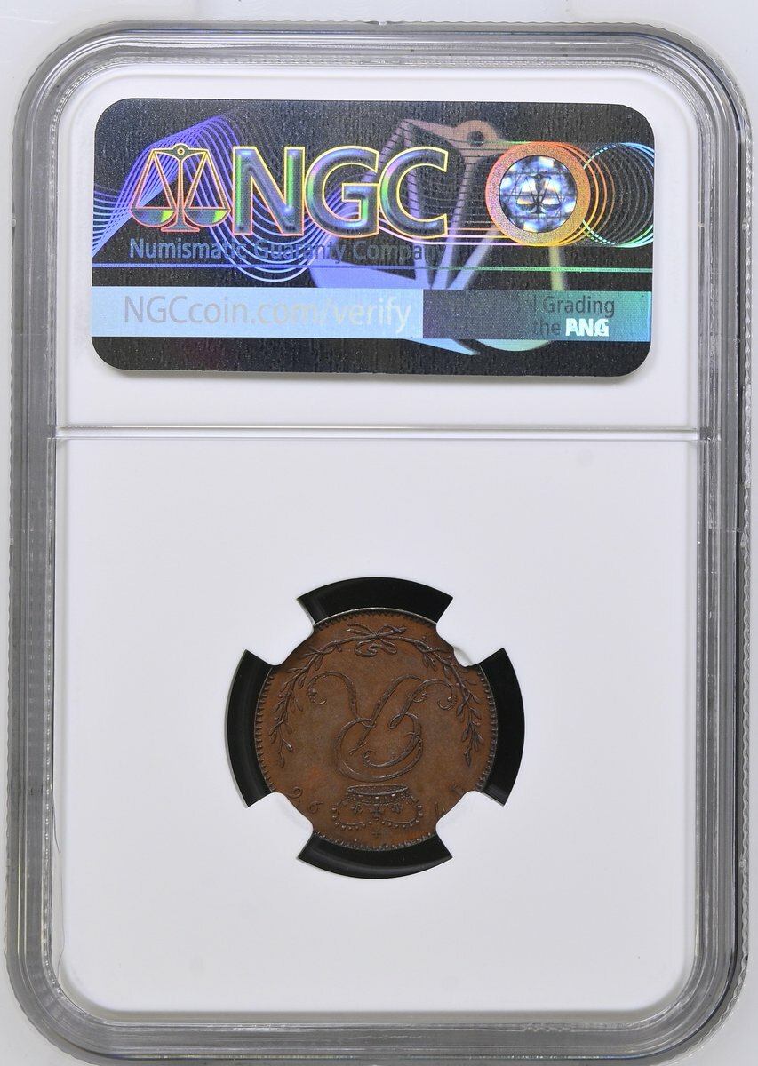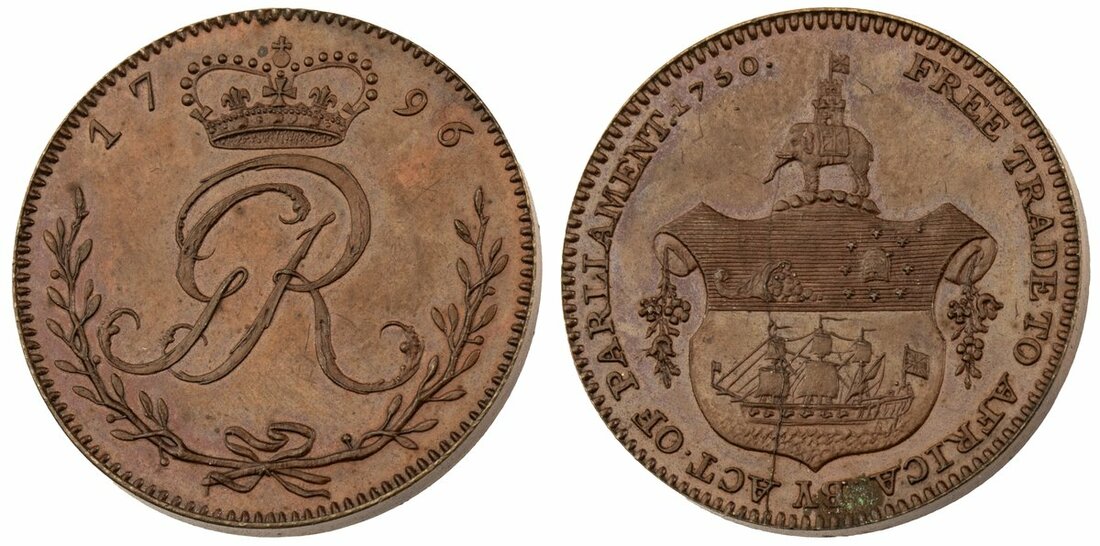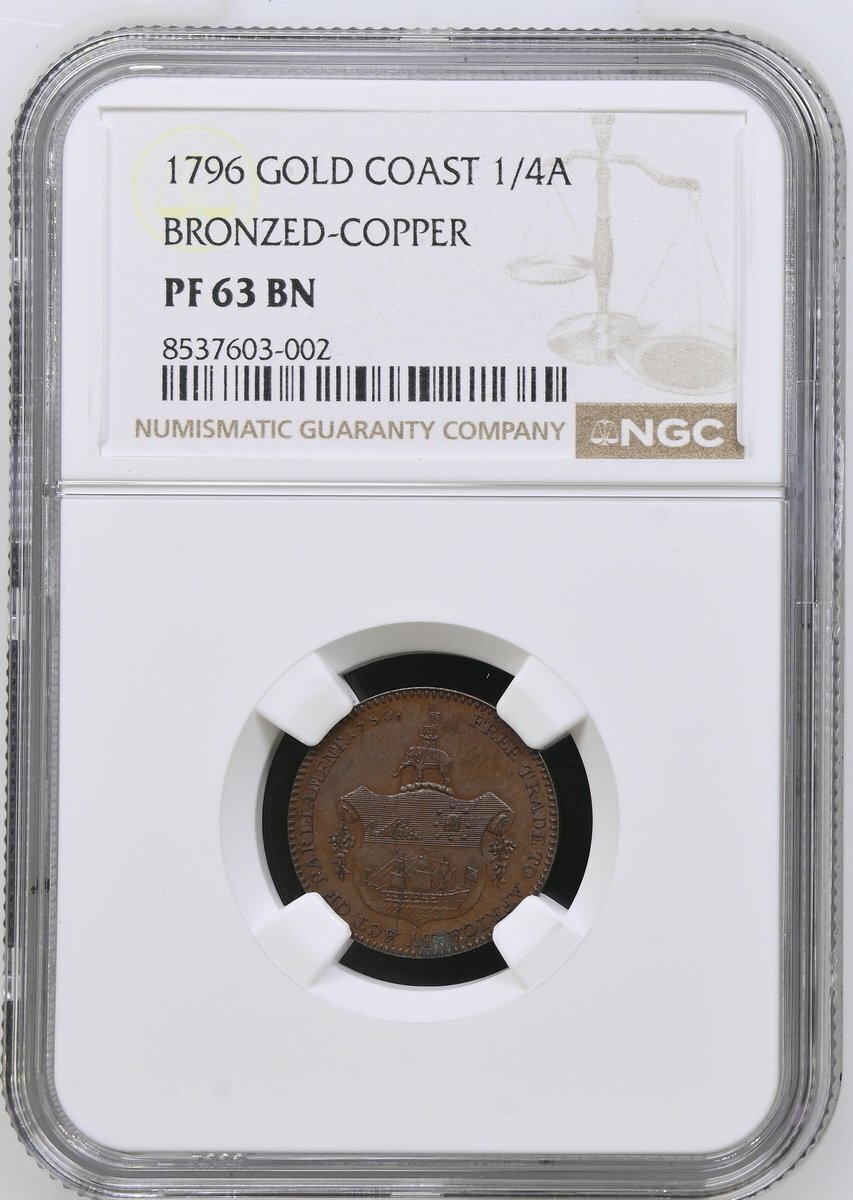 NGC PF63 BN | Gold Coast, George III (1760-1820), Bronzed Proof Quarter Ackey, 1796, Birmingham, Soho Mint, Crowned GR royal cypher, date above, wreath below, rev. FREE TRADE TO AFRICA . BY ACT · OF PARLIAMENT . 1750 ., coat of arms, edge plain, 3.84g, 6h (KM Pn3), small spot of verdigris to obverse and hairline die flaw through legend at 6 o'clock, otherwise with handsome chocolate brown surfaces, toned to glass-like fields, much as struck, in NGC holder, graded PF63 BN (Cert. #8537603-002)