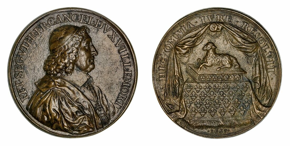 France, Pierre Séguier, Bronze Medal, 1663, by J. Warin, PET • SEGVIER • FR • CANCEL • DVX VILLEMORT, draped and capped bust right, rev. HIC • OMNIA • IVRE • RESOLVIT • on banner, lamb reclining on the Gospels on a table covered with a fringed carpet decorated with fleurs-de-lis, date below, 54mm, 53.52g (Jones 272), pitted to obverse and with darker toning spots, very fine