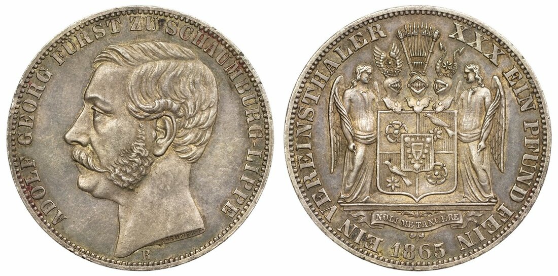 (x) Germany, Schaumberg-Lippe, Adolf Georg (1860-1893), Vereinsthaler, 1865 B, Hanover, bare head left, rev. XXX EIN PFUND FEIN EIN VEREINSTHALER | 1865, square-topped shield flanked by winged supporters, edge incuse lettered upwards, 18.51g, 12h (Jaeger 16; Thun 390; AKS 19; Kahnt 527; KM 47), some light hairlining in the fields and minor rim bruising, otherwise with an attractive lilac tone and lustre, extremely fine