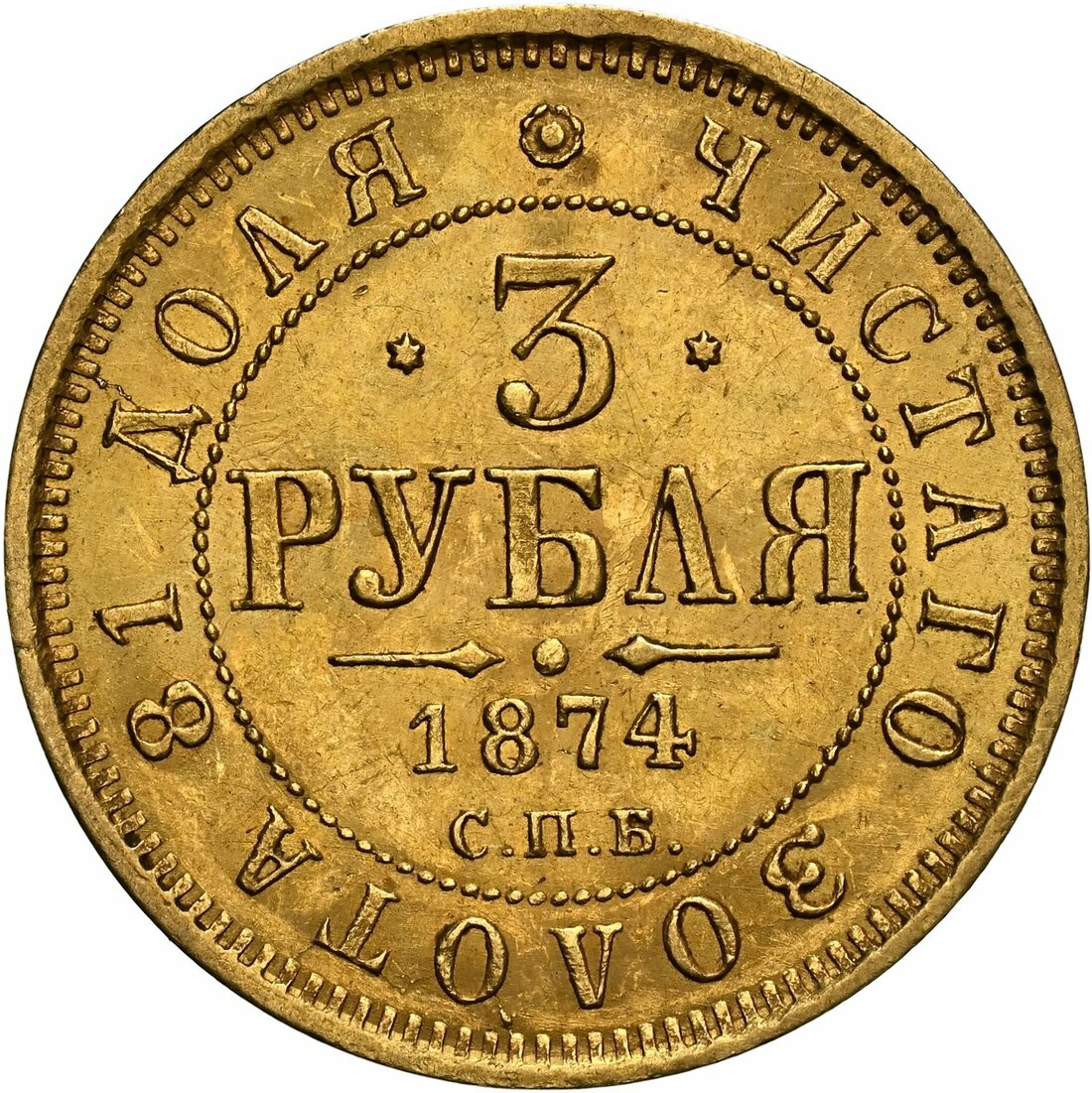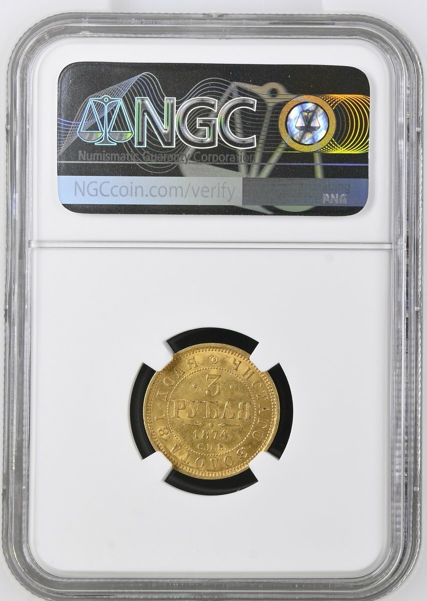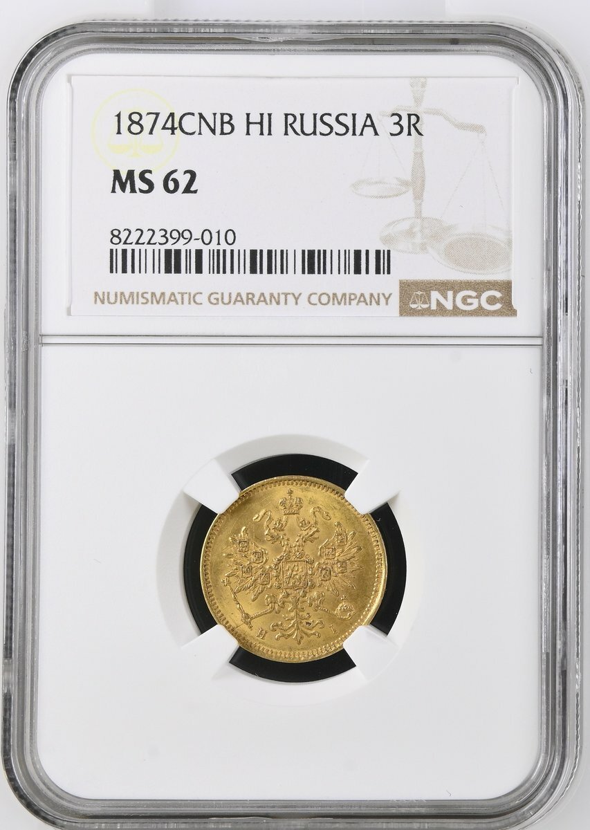 (g) NGC MS62 | (Tsarist) Russia, Alexander II (1855-1881), Gold 3-Roubles, 1874 CHB, St Petersburg, edge centre engrailed, 3.92g, 12h (Bitkin 36; KM Y26; Fb. 164), some minor scratches to fields, otherwise lustrous with a hint of tone overlying original fields, extremely fine, scarce, in NGC holder, graded MS62 (Cert. #8222399-010)