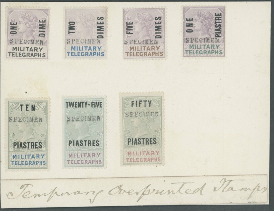 Military Telegraphs for use in Egypt: 1887 Surcharges: 1 dime on 1d. and values to 50pi. on 10/- overprinted "specimen" type 9 and affixed to De la Rue sheet marked "Temporary Overprinted Stamps"; top value showing light discolouration. (7 values)