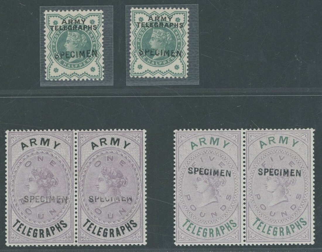 Army Telegraphs for use in South Africa: 1899 ½d. blue-green overprinted "specimen" type 15 (2), from the second setting, £1 lilac and black and £5 lilac and green, horizontal pairs overprinted "specimen" type 15, large part original gum; £1 light gum bends