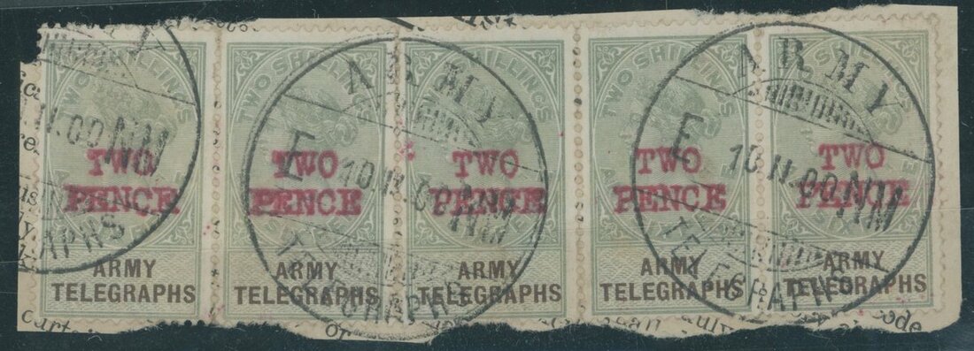 Army Telegraphs for use in South Africa: 1900 "two/pence" in red on 2/6d. green and brown, a strip of five tied on piece by "E-NM" (Enslin) datestamp 1900 (10 Feb.); a rare multiple
