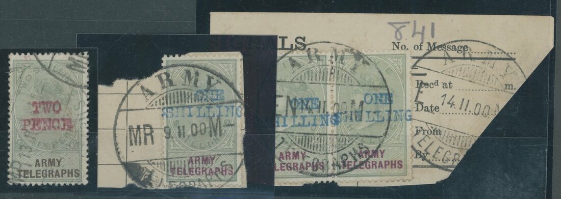 Army Telegraphs for use in South Africa: 1900 "two/pence" on 2/6d. and "one/shilling" on 5/-, both cancelled by "MR-M" (Modder River) datestamp 1900 (Feb.); some minor discolouration on the lower value. Each with B.P.A. Certificate (2012) and 1900 "one/shilling" on 5/- green and purple, horizontal pair affixed to precancelled piece of form and tied by "EN-M" (Enslin) datestamp 1900 (14 Feb.); a very scarce multiple