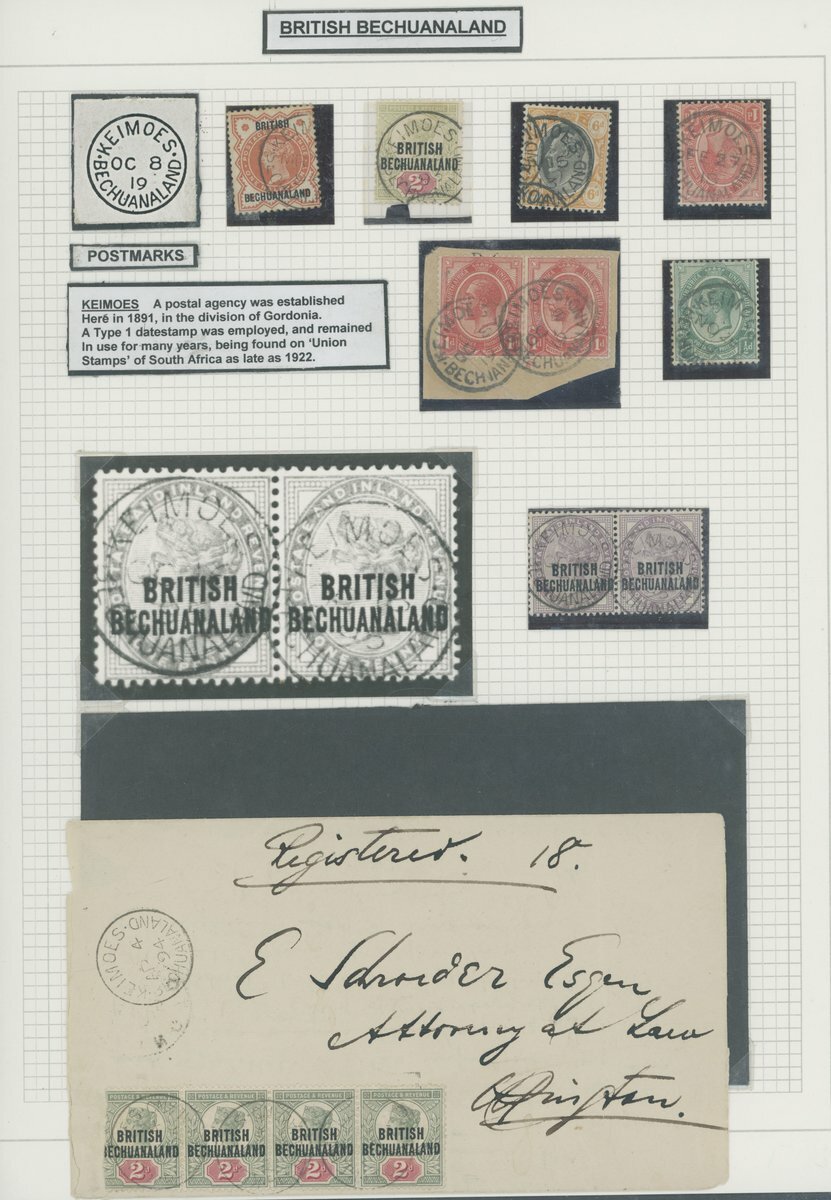 Keimoes: 1894 (4 Apr.) envelope registered to Upington bearing 1891-1904 2d. grey-green and carmine strip of four (left stamp short at side) cancelled by superb strikes of "keimoes/bechuanaland" c.d.s., the reverse with P.O. Upington (5.4) c.d.s.; opened at sides with message on the inside. Also a group of adhesives including Union of South Africa as this postmark was used until 1922