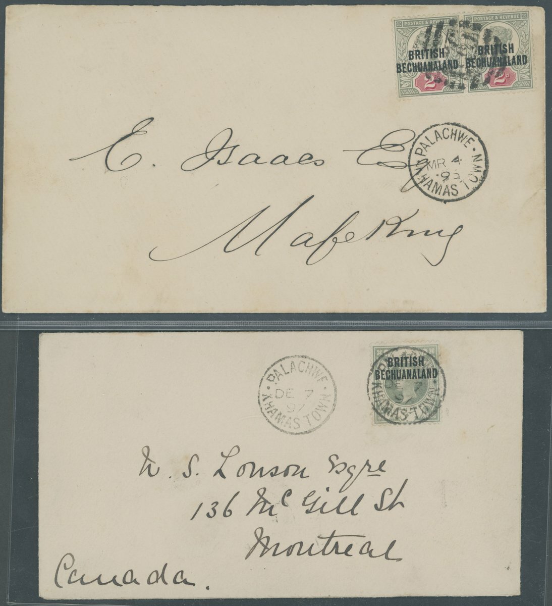 1895 (4 Mar.) envelope to Mafeking bearing 1891-1904 2d. pair cancelled by a single strike of "676" barred oval with a fine strike of "palachwe/khamas town" c.d.s. alongside, the reverse bearing Mafeking (8.3) arrival c.d.s. and 1897 (7 Dec.) envelope to Canada bearing 1891-1904 1/- dull green tied by a central strike of "palachwe/khamas town" c.d.s. with a second strike alongside, the reverse with Montreal (15.1) arrival c.d.s. Fine and scarce usages (2)