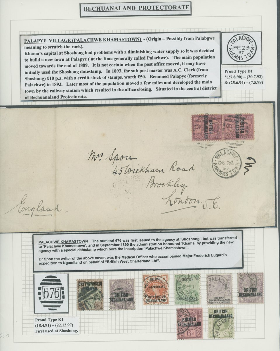 British West Charterland Expedition: 1897 (22 Dec.) long envelope to London bearing 1891-1904 6d. vertical pair tied by light strikes of "676" barred oval with a good strike of "palachwe/khamas town" c.d.s. alongside, the reverse with Brockley squared circle arrival c.d.s. (14.1) and manuscript "Extracts from Major Lugards reports"; two vertical folds at centre and left. Written by Dr Spon who was the medical officer who accompanied Major Frederick Lugard's expedition to Ngamiland on behalf of the 'British West Charterland Ltd.' Also a group of adhesives bearing Palachwe postmarks