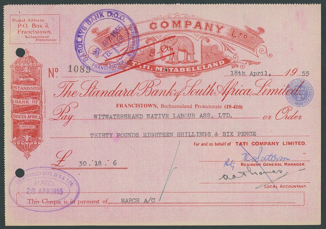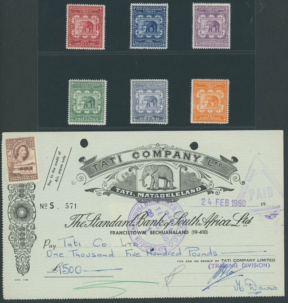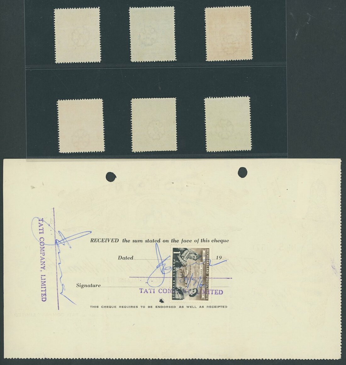 1/- to £5, set of six, very fine mint; with Tati Company Ltd. cheques from 1955 and 1960. Scarce so fine.