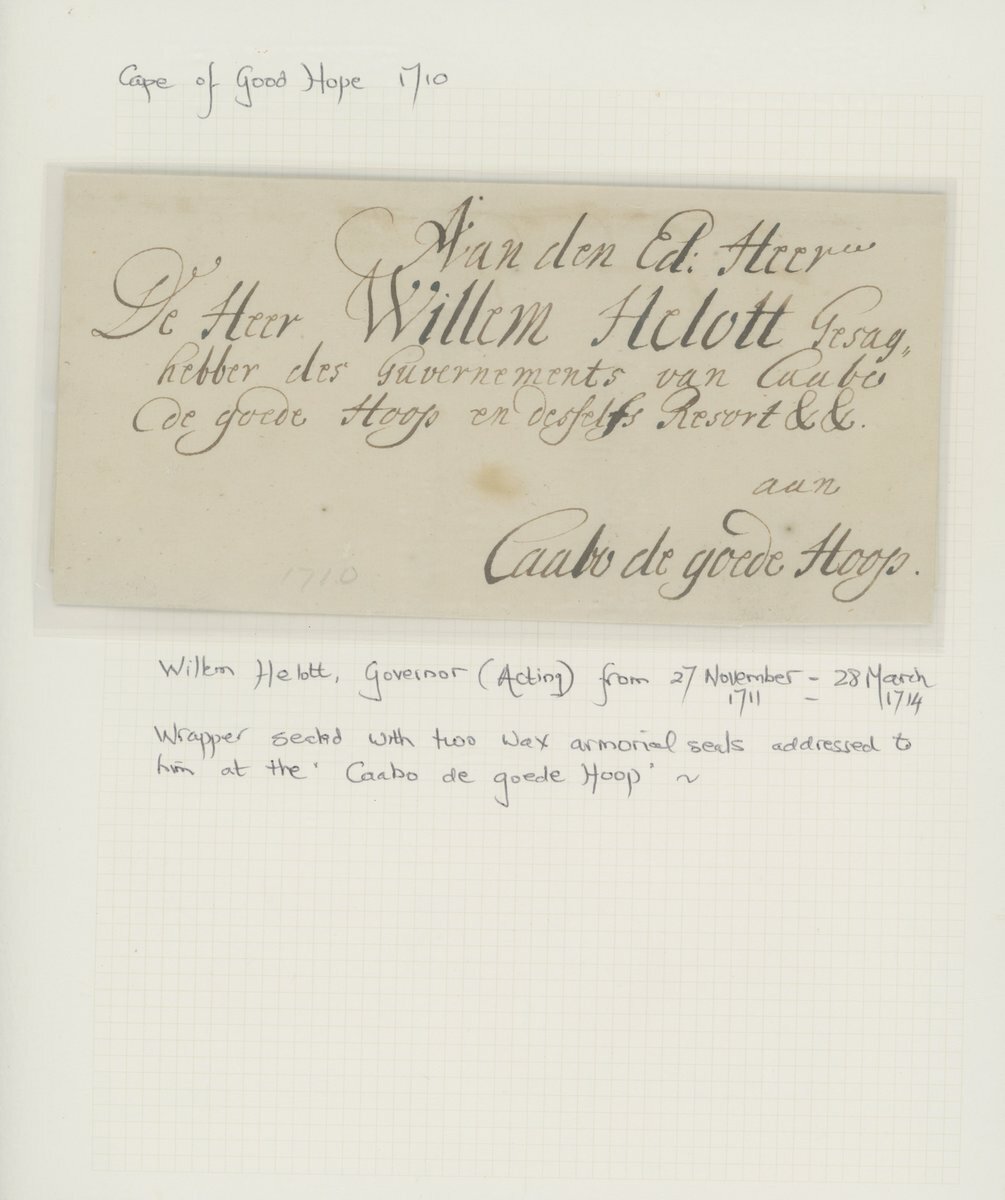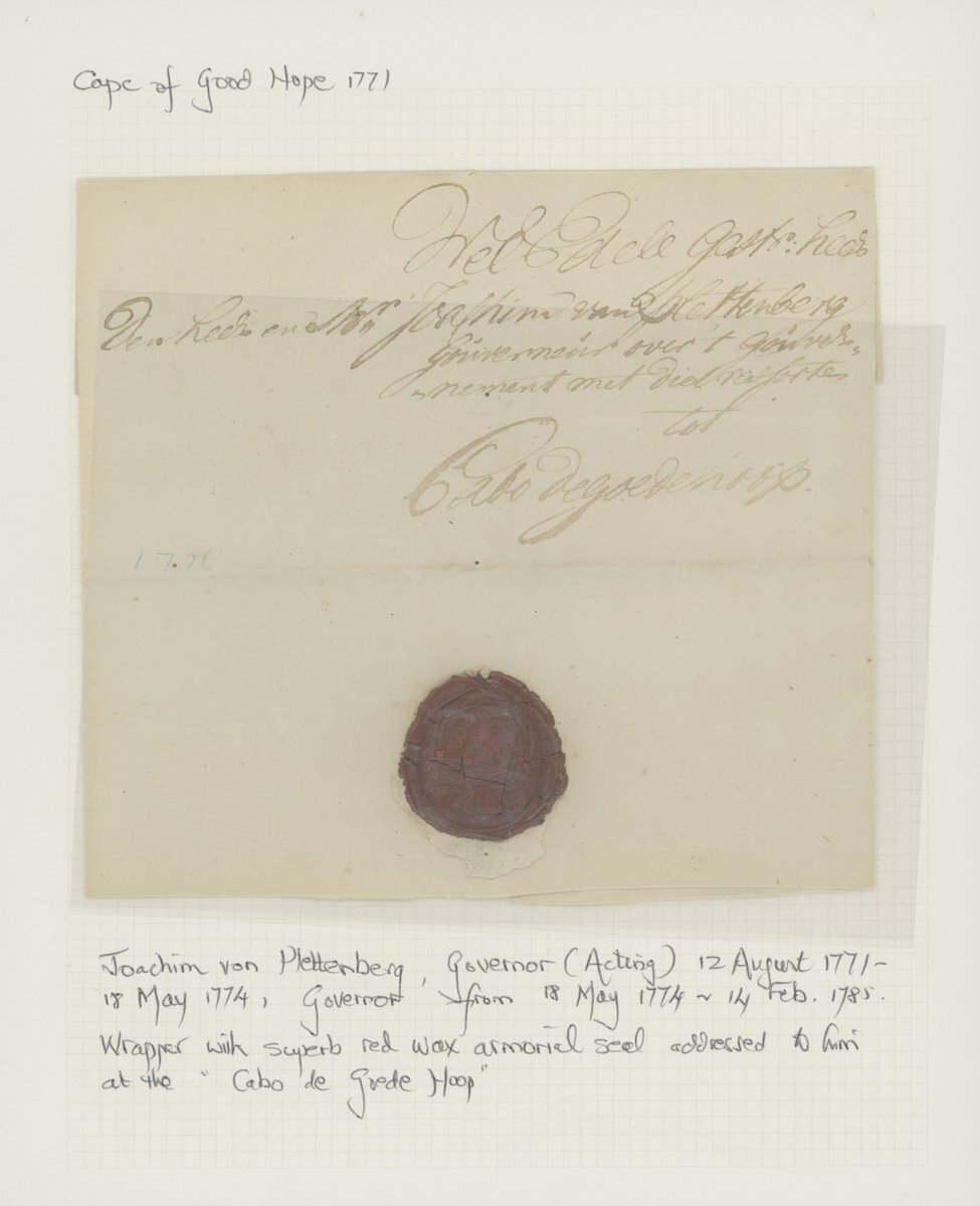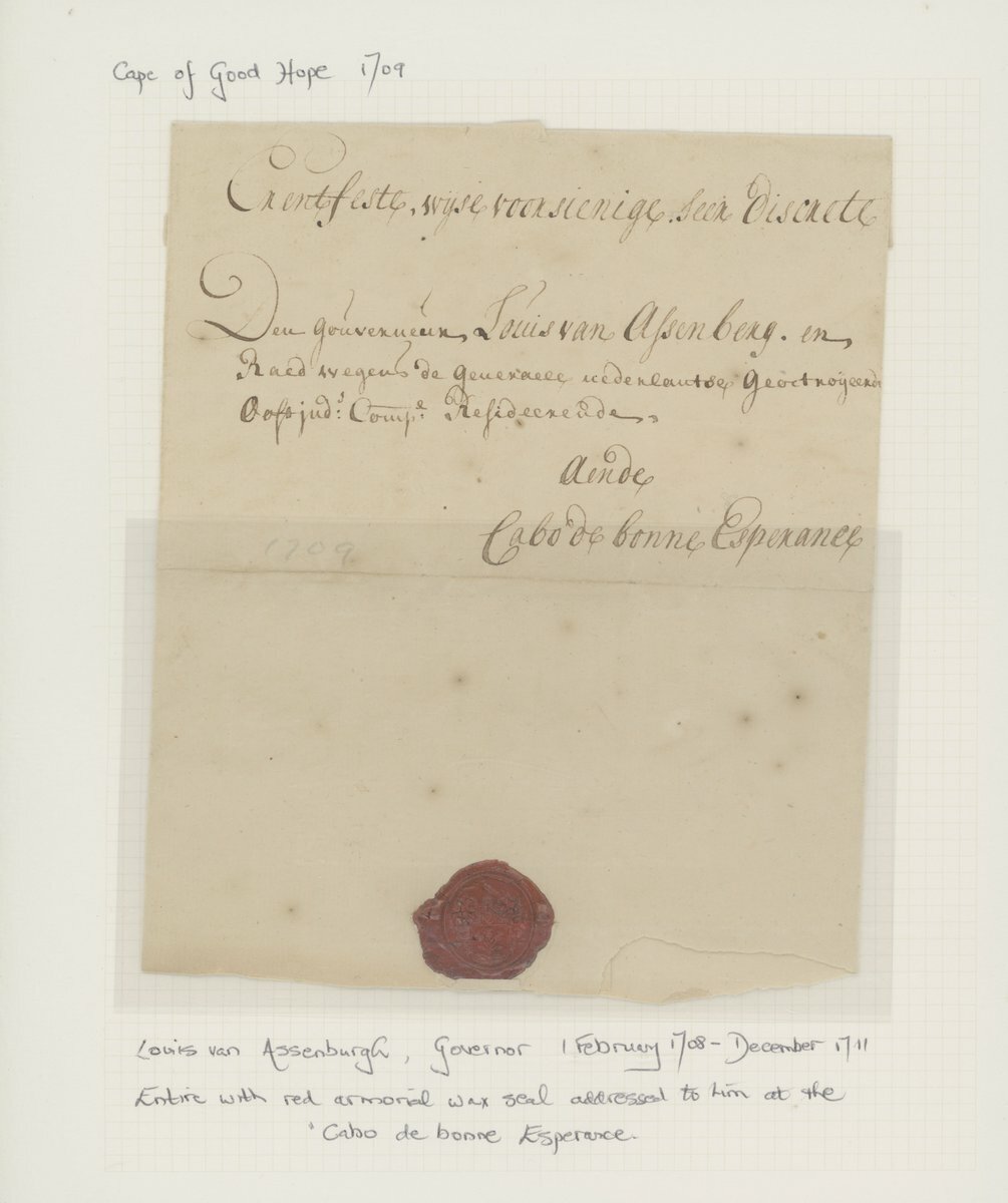1709-1771, six entires ex The "Kronenberger" Collection of Commanders and Governors Letters comprising 1709 entire to Louis van Assenburgh at "Cabo de bonne Esperance", 1710 entire to "Heer Willem Helott, Caabo de goede Hoop", fine, 1723 (10 Sept.) to Maurits Pasques de Chavonnes at "Cabo de goede Hoop", 1724 entire to "Myn Heer Jan de la Fontaine, Cabo de Goede Hoop", 1754 entire to Rijk Tulbagh at "Cabo de Goede Hoop", 1771 entire to Joachim van Plettenberg at "Cabo de goede hoop". The majority with red wax seals on the reverse, some minor faults though a rare and valuable selection.