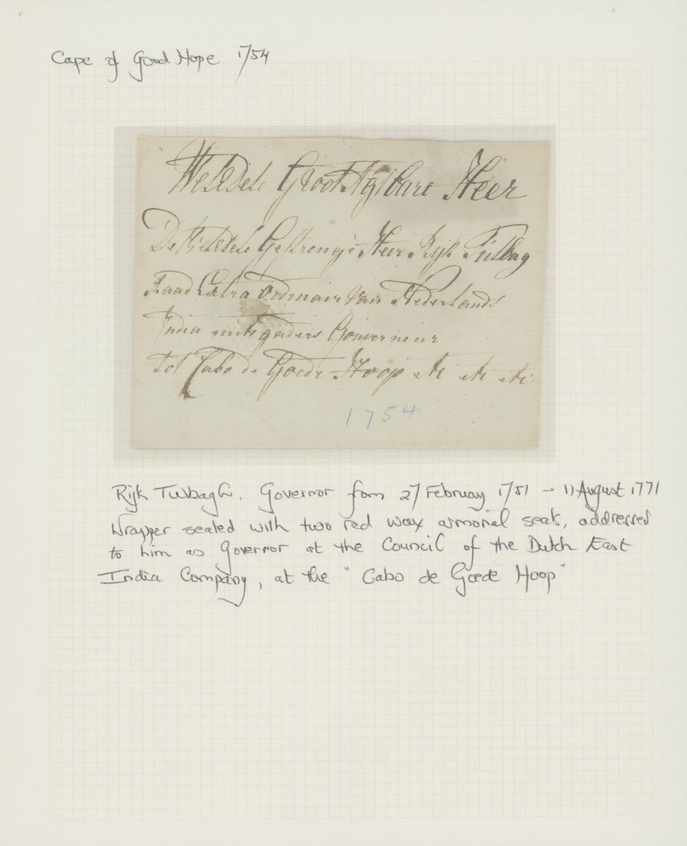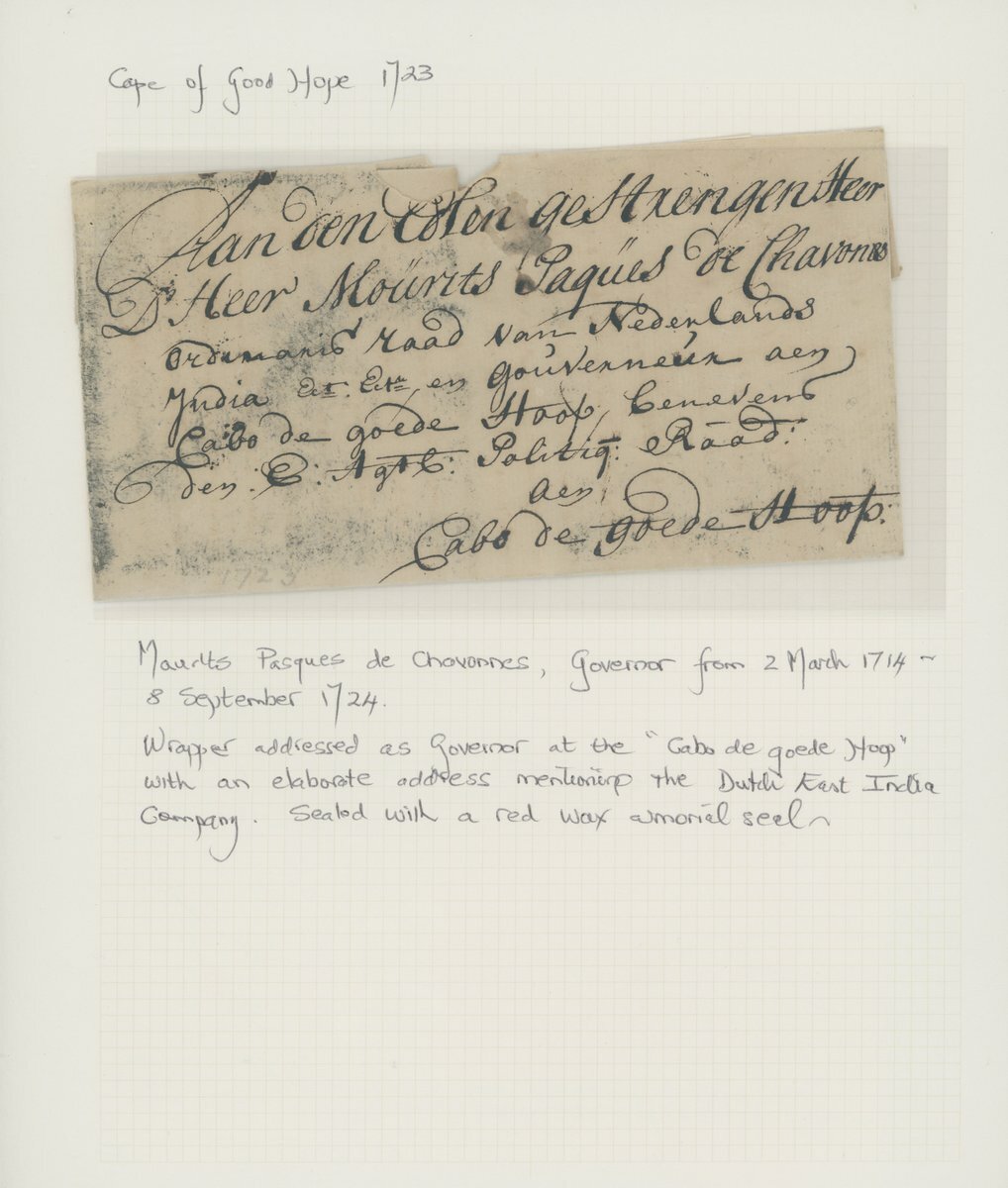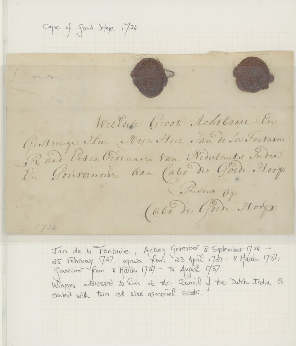 1709-1771, six entires ex The "Kronenberger" Collection of Commanders and Governors Letters comprising 1709 entire to Louis van Assenburgh at "Cabo de bonne Esperance", 1710 entire to "Heer Willem Helott, Caabo de goede Hoop", fine, 1723 (10 Sept.) to Maurits Pasques de Chavonnes at "Cabo de goede Hoop", 1724 entire to "Myn Heer Jan de la Fontaine, Cabo de Goede Hoop", 1754 entire to Rijk Tulbagh at "Cabo de Goede Hoop", 1771 entire to Joachim van Plettenberg at "Cabo de goede hoop". The majority with red wax seals on the reverse, some minor faults though a rare and valuable selection.