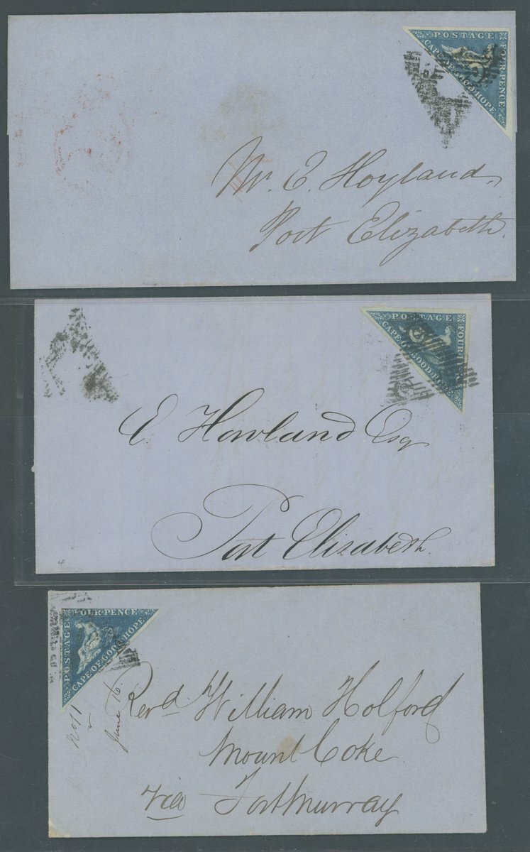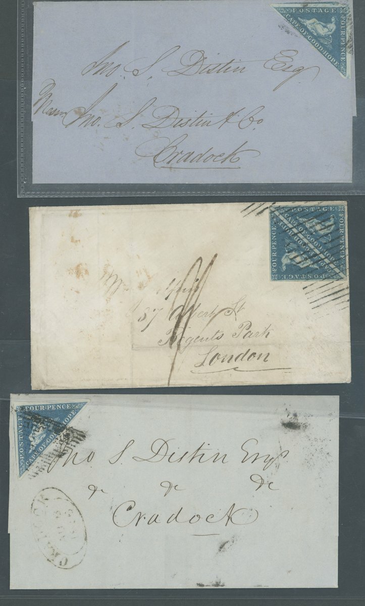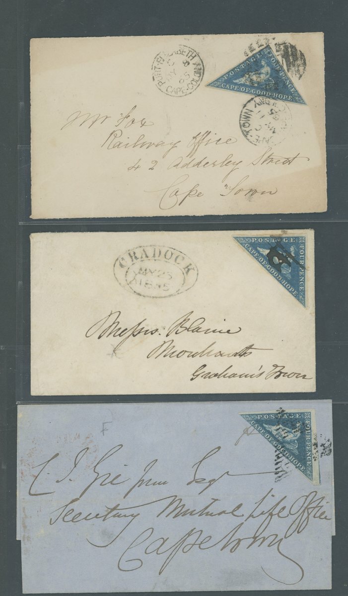 A group of Cape Triangulars on cover (18) comprsing 4d. pair on 1854 envelope to London, thirteen entires and envelopes bearing 4d. blue all sent locally in South Africa and four envelopes bearing 6d. lilac all sent to the UK, a little soiled in places and with a few other minor faults, otherwise a good and useful group