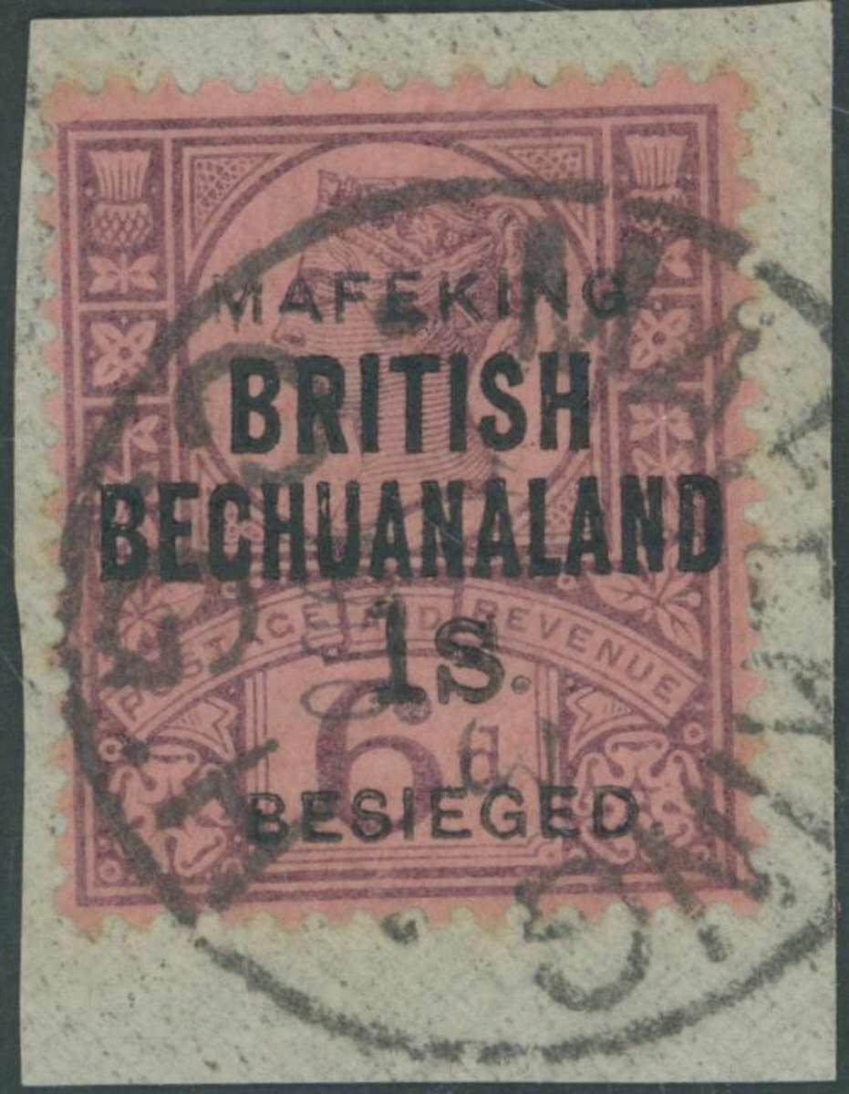 1/- on 6d. purple on rose-red of Brtish Bechuanaland, with sans serif overprint, used and tied to small piece by