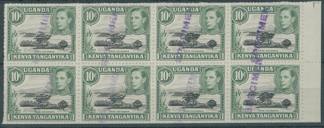 10c. black and green block of eight from the right of the unique archival sheet, each stamp handstamped