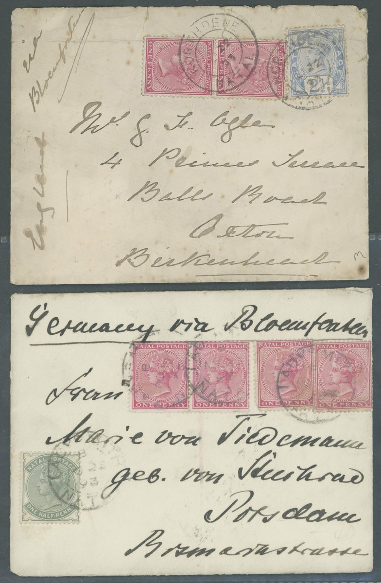 1893 pair of envelopes, one to Germany and the other to England, both sent 'via Bloemfontein' route, the first bearing 1882-89 ½d. and 1d. (4) tied by faint
