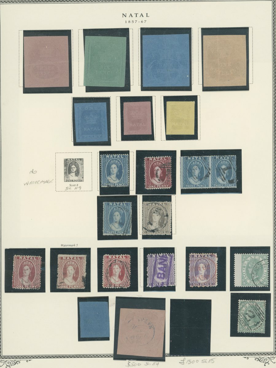 1857-95 mint and used collection on album pages including reprints of all values for the embossed issue (7), genuine examples of 3d. rose used ( BPA Cert.) and 1d. blue unused, 1859-60 1d. and 3d. used, 1861-62 3d. and 6d. used, 1867 1/- used (2), 1874-99 CC with values to 5/- mint including 4d. brown (Sismondo Cert. for the 5/) as well as used with 5/- (3), 1888 1/- postage overprints mint and used, good to fine