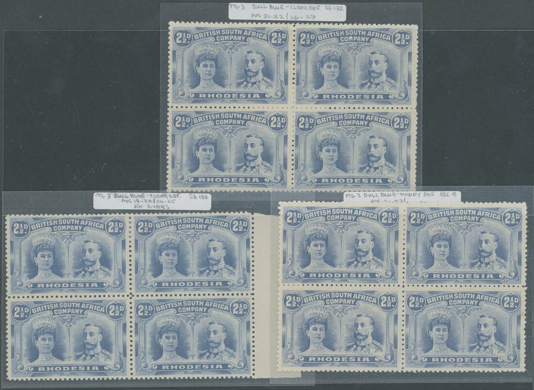 2½d. dull blue, three blocks of four, one from the right of the sheet and ex Gibbs and the third with a muddy impression; all with large part original gum, fine. S.G. 132 group
