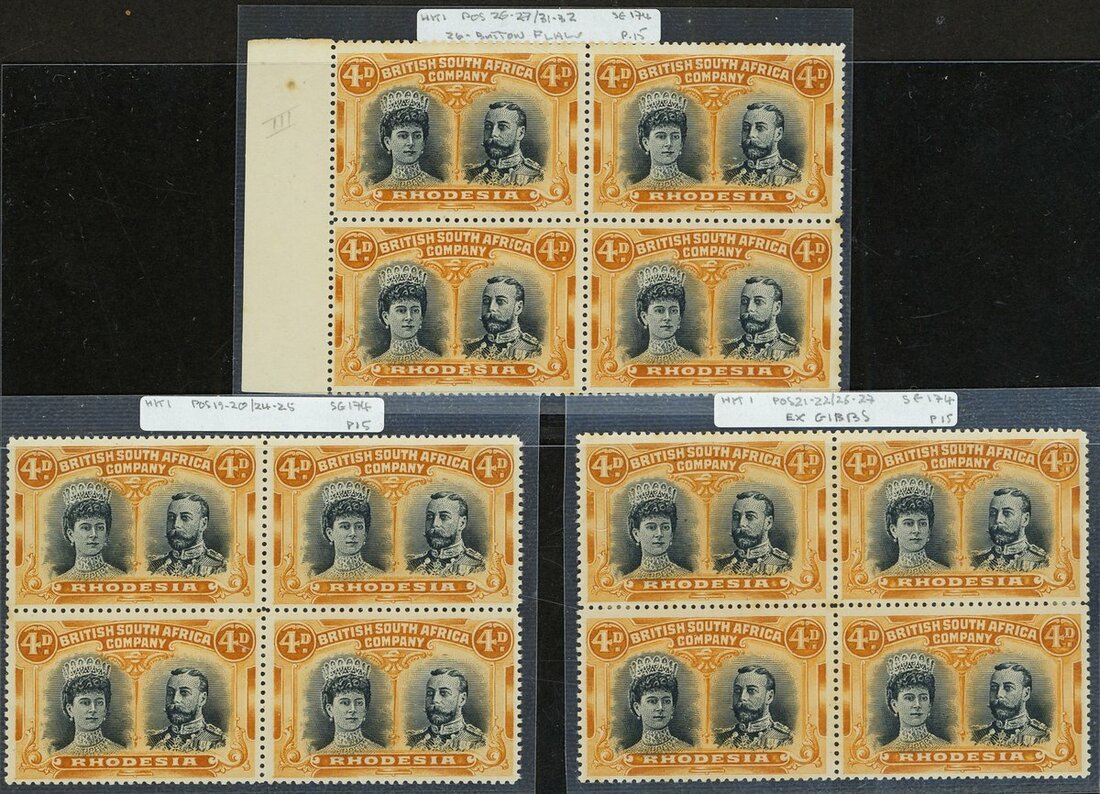 A group of perf. 15 4d. black and orange blocks of four (3) all positioned comprising [19-20, 24-25], [21-22, 25-27] (Ex Gibbs) and [26-27, 31-32], [26] showing button flaw, the latter block a little toned at the extremities otherwise fine mint. S.G. 174