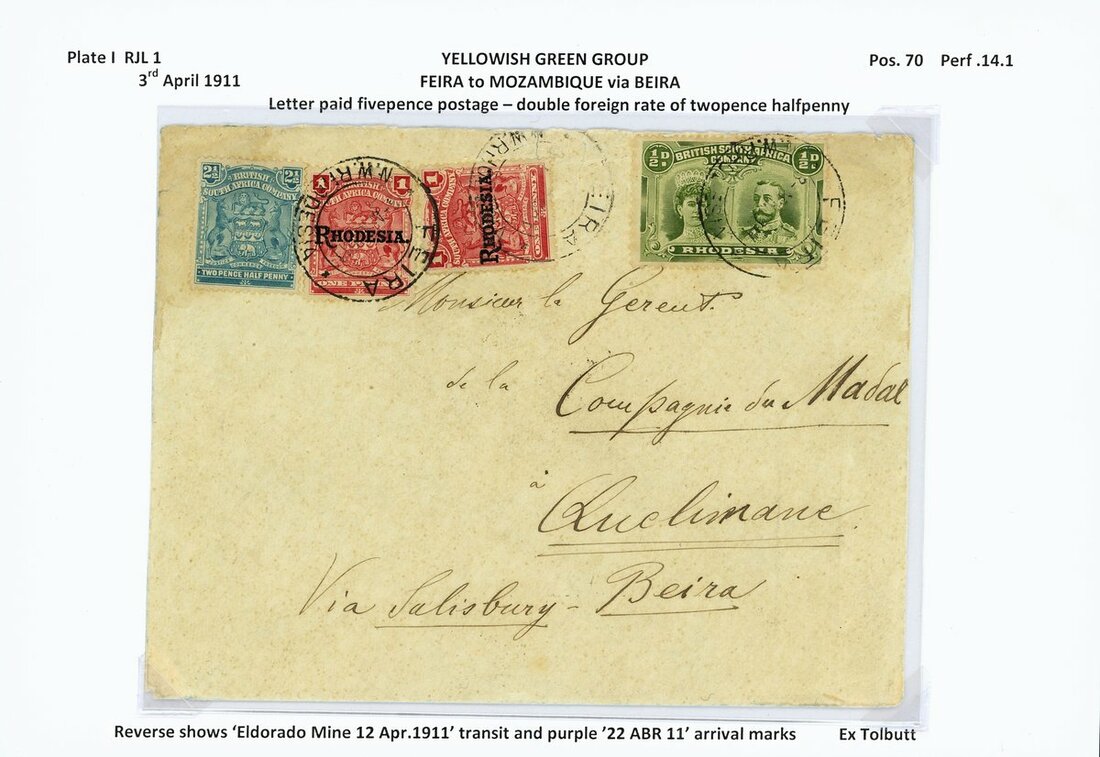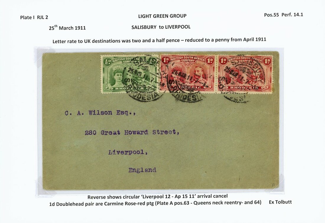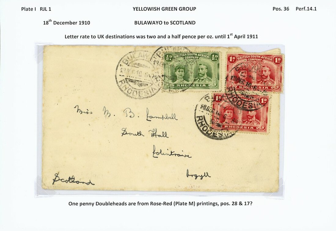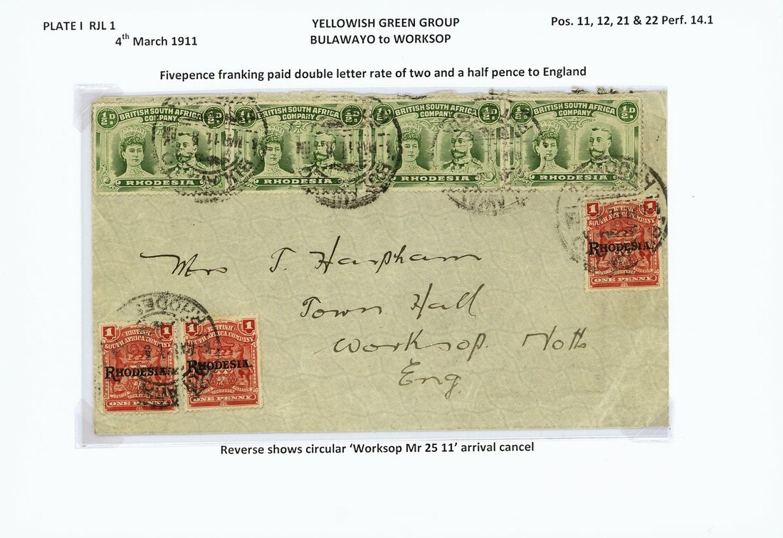 A group of cards and covers (7) all bearing ½d. values including 1910 envelope from Umtali to Transvaal bearing RJL 1 (3) in combination with 1909 ½d. and 1d., 1910 envelope to Scotland bearing ½d. in combination with 1d. (2), 1911 envelope to England bearing RJL 1 (4) in combination with 1909 1d. (3), 1911 envelope from Feira to Mozambique bearing RJL 1 in combination with 1898 Arms 2½d. and 1909 1d. (2), 1911 envelope from Salisbury to England bearing RJL 2 in combination with 1d. pair, 1917 envelope from Salisbury to Cape Town bearing RJL 4 in combination with Admiral 1d. and 1913 postcard from Plumtree to Germany bearing RJL 5 (2) and 1d.; a useful group